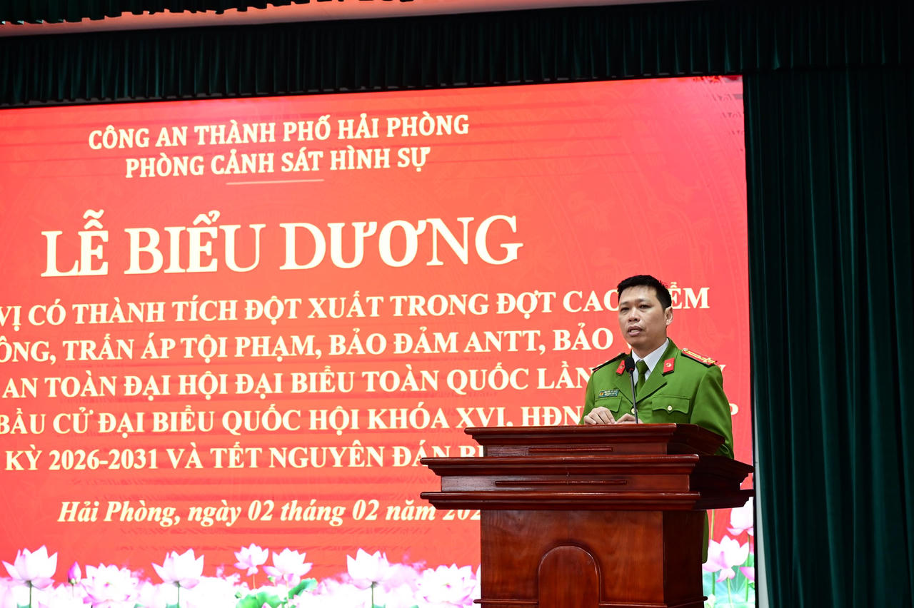 (PLVN) - Ngày 2/2, Công an TP Hải Phòng tổ chức Lễ biểu dương các đơn vị có thành tích đột xuất trong đợt Cao điểm tấn công, trấn áp tội phạm đảm bảo ANTT Đại hội Đại biểu toàn quốc lần thứ XIV của Đảng, bầu cử Đại biểu quốc hội khóa XVI, HĐND TP Hải Phòng nhiệm kỳ 2026-2031, Tết nguyên đán Bính Ngọ năm 2026.