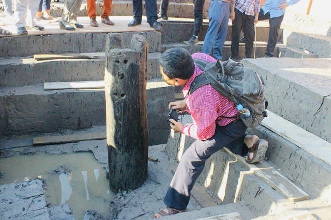 Phần giữa ao trũng sâu, do đang được tiến hành nạo vét bùn. Mặt bùn sau khi tát cạn nước nhanh chóng bị khô nứt. Các đầu cọc đều có hiện tượng bị mòn, gãy, nứt nẻ. Tình trạng xuất lộ cho thấy các cọc gỗ dễ bị hủy hoại do phơi ra môi trường tự nhiên. Do đó, Viện Khảo cổ học, ngành Văn hóa huyện Thủy Nguyên và TP Hải Phòng đã đề xuất khai quật khẩn cấp nhằm mục đích nghiên cứu và có căn cứ đề xuất cho vấn đề bảo tồn và bảo quản theo quy định.