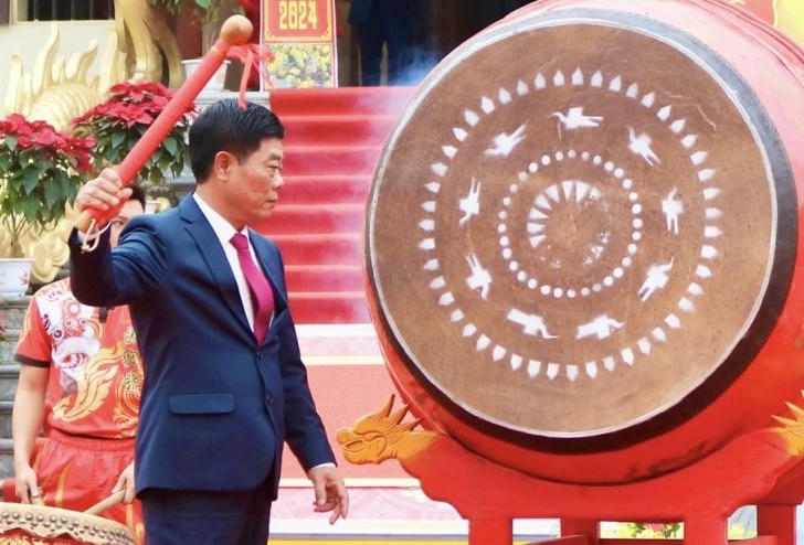 Ông Nguyễn Huy Hoàng - Chủ tịch huyện Thuỷ Nguyên đánh trống Khai hội. |