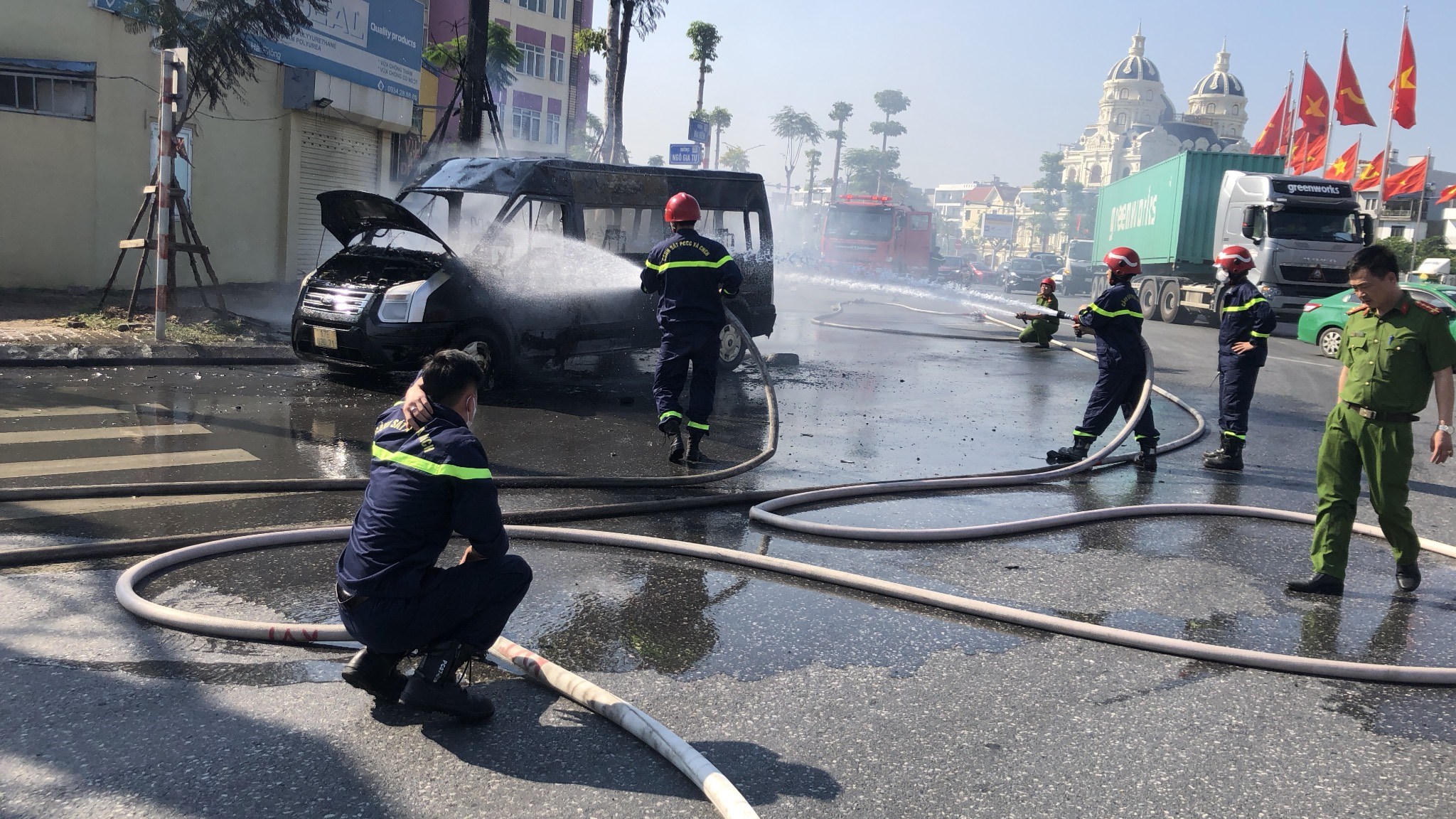 Lực lượng PCCC xử lý vụ cháy xe ô tô tại vòng xuyến giao nhau giữa đường Bùi Viện và đường Lê Hồng Phong |