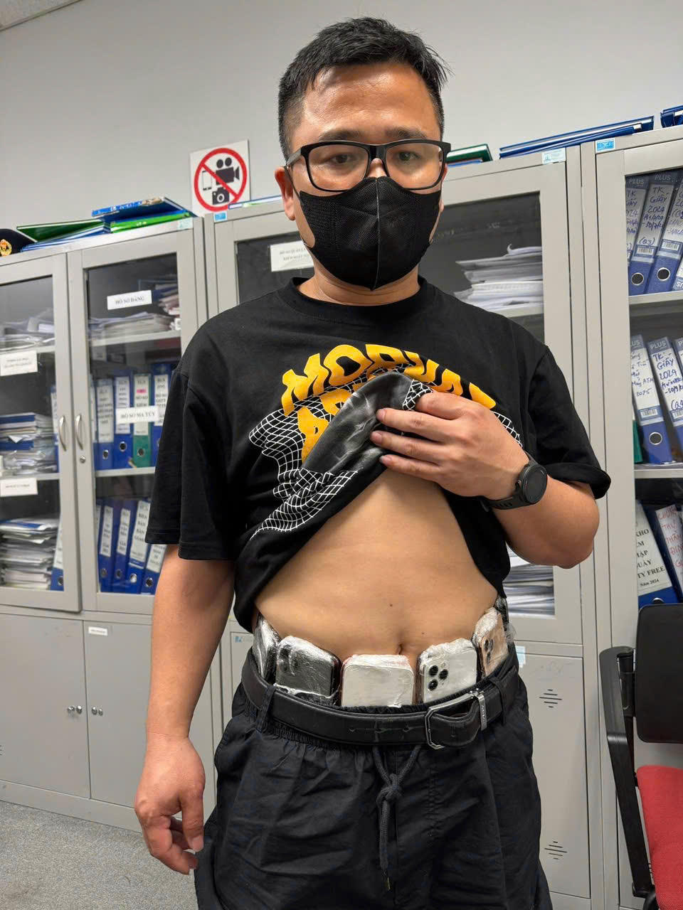 Đối tượng quấn điện thoại quanh người nhằm vận chuyển trái phép hàng hóa. (Ảnh: H.Hậu) |
