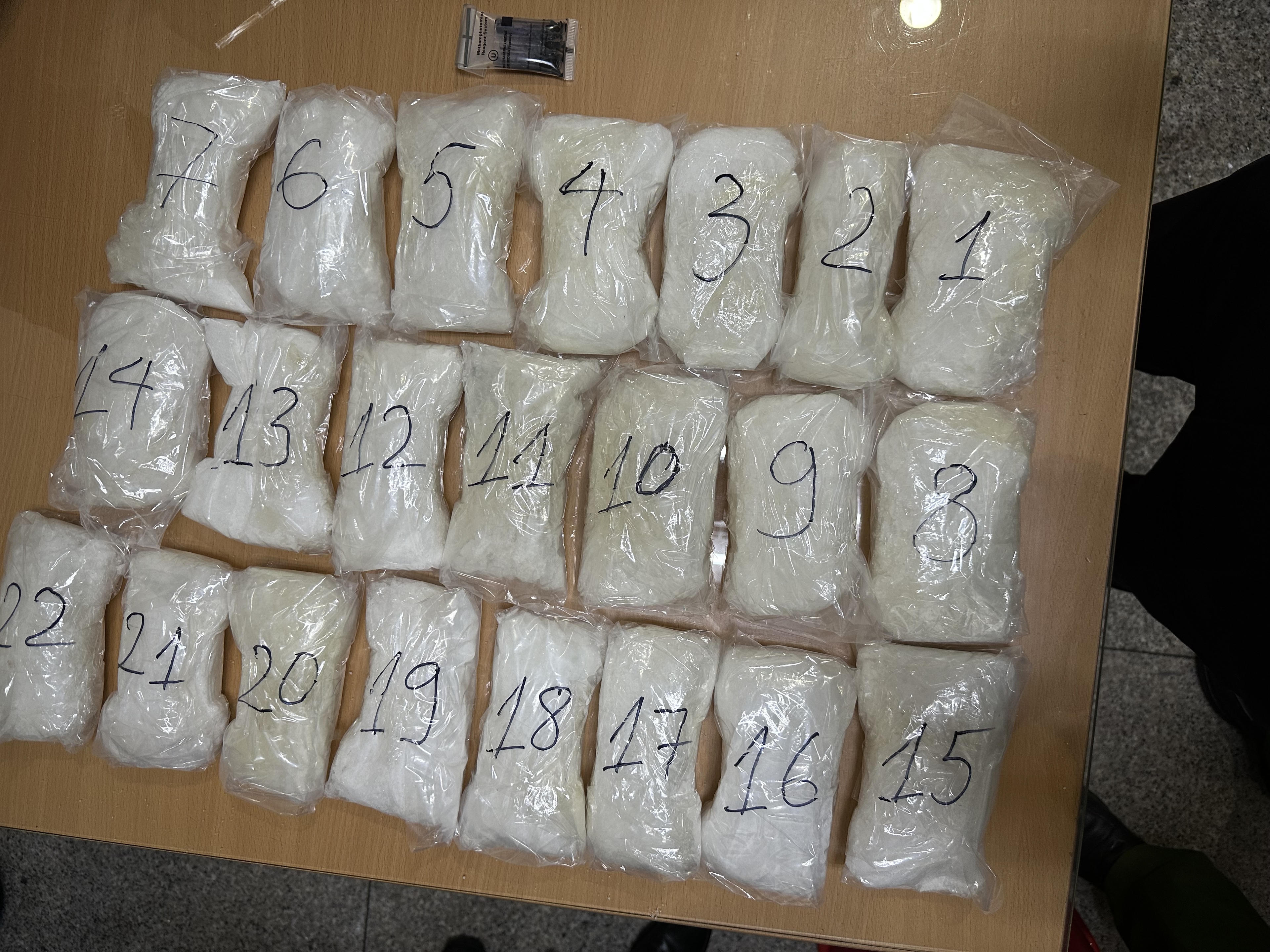 Tổ công tác của các lực lượng phối hợp đã xác định trong hành lý ký gửi của đối tượng Bong Suk Shya có cất giấu 22 túi nilon có chứa tinh thể không màu trong ruột các khối thớt gỗ. Kết quả giám định nhanh xác định tổng trọng lượng chất nghi vấn là 5.027 gam, dương tính với Methamphetamine.