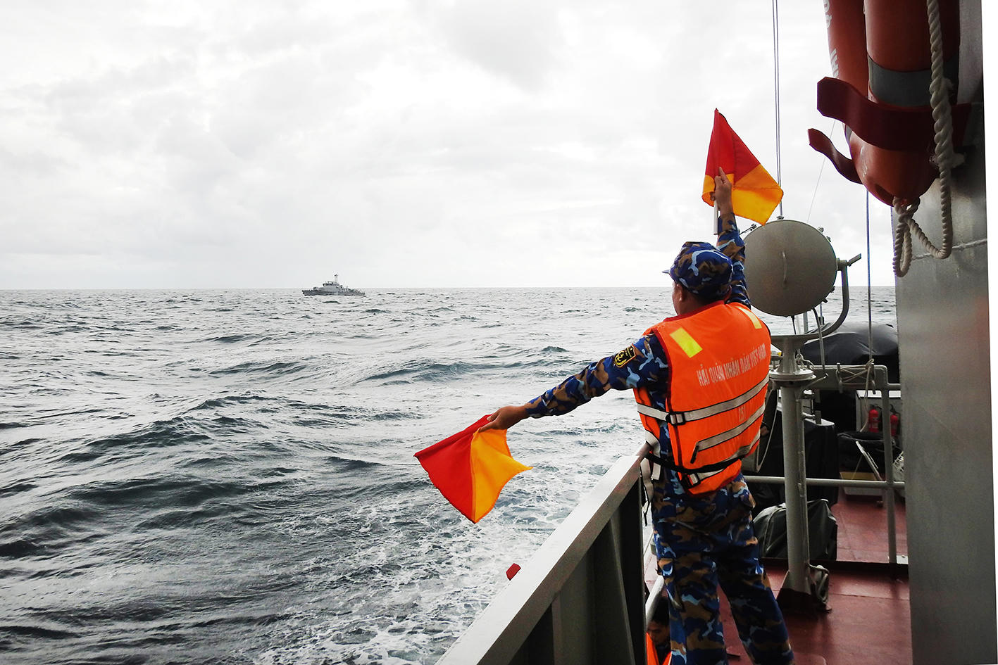 Tàu hải quân hai nước huấn luyện cờ tay trong quá trình tuần tra |