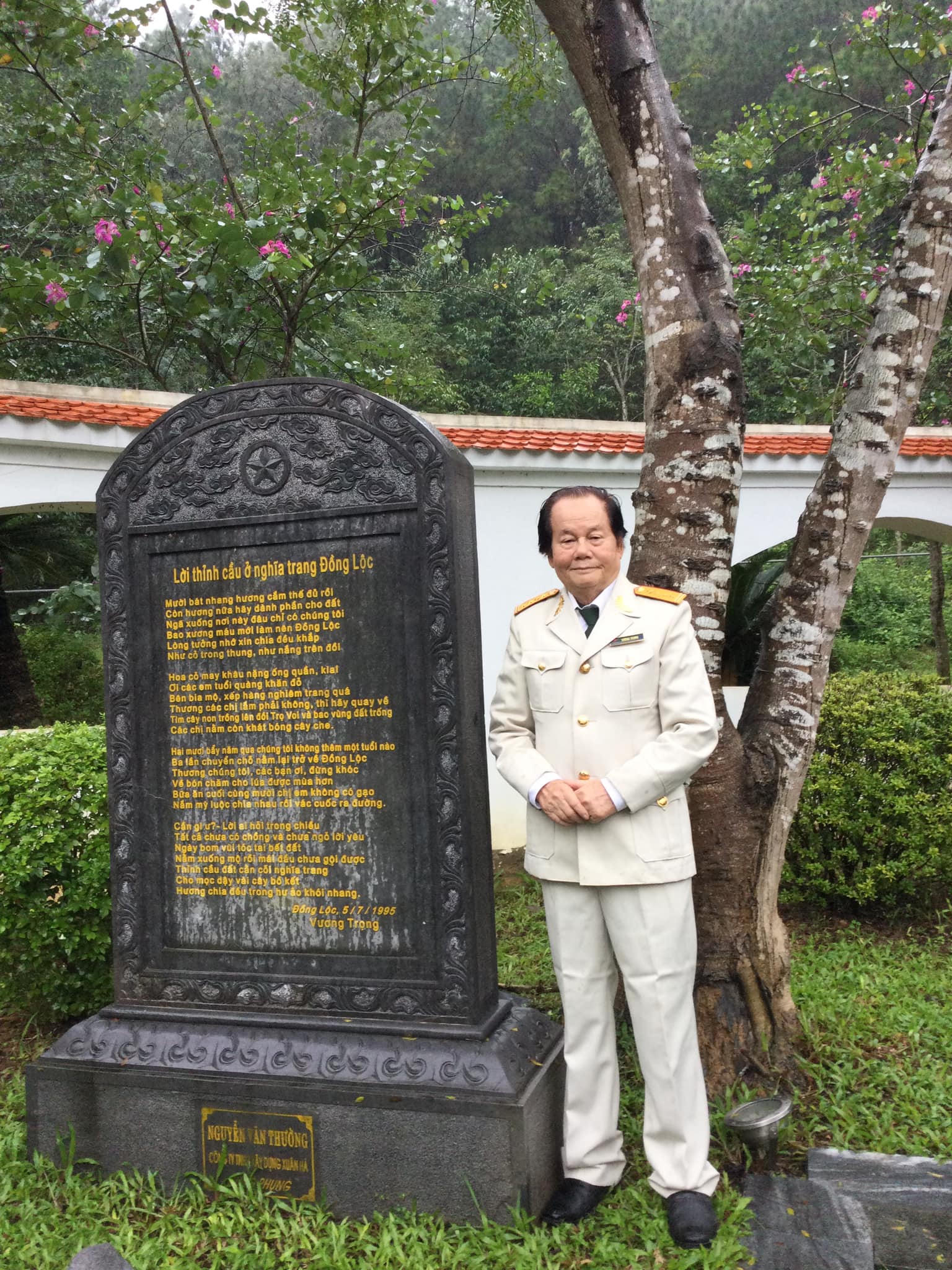 Đại tá, nhà thơ Vương Trọng bên tấm bia đá “Lời thỉnh cầu ở nghĩa trang Đồng Lộc”. (Ảnh: NVCC) |