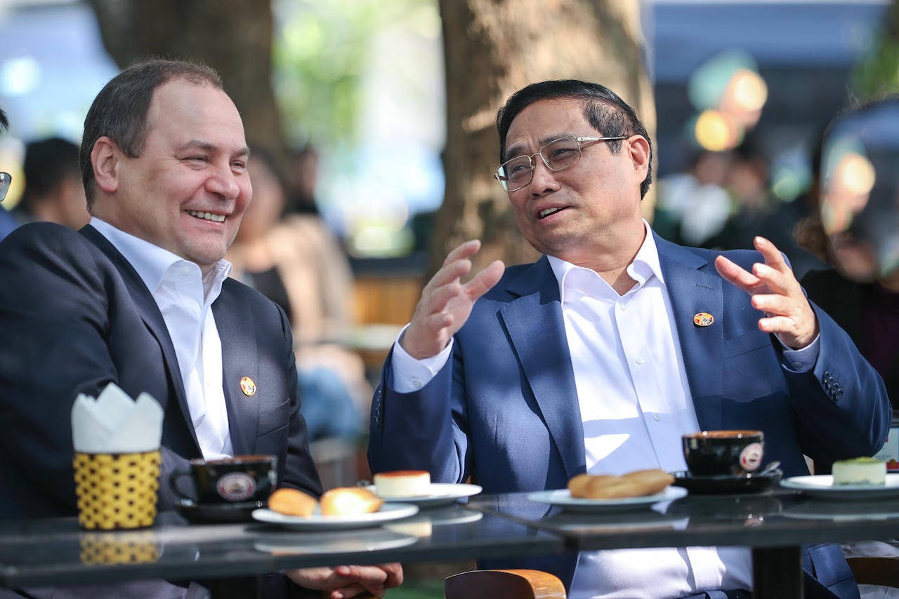 Thủ tướng Phạm Minh Chính và Thủ tướng Belarus thưởng thức hương vị cà phê Việt Nam tại quán cà phê dưới chân Cột cờ Hà Nội - Ảnh: VGP/Nhật Bắc