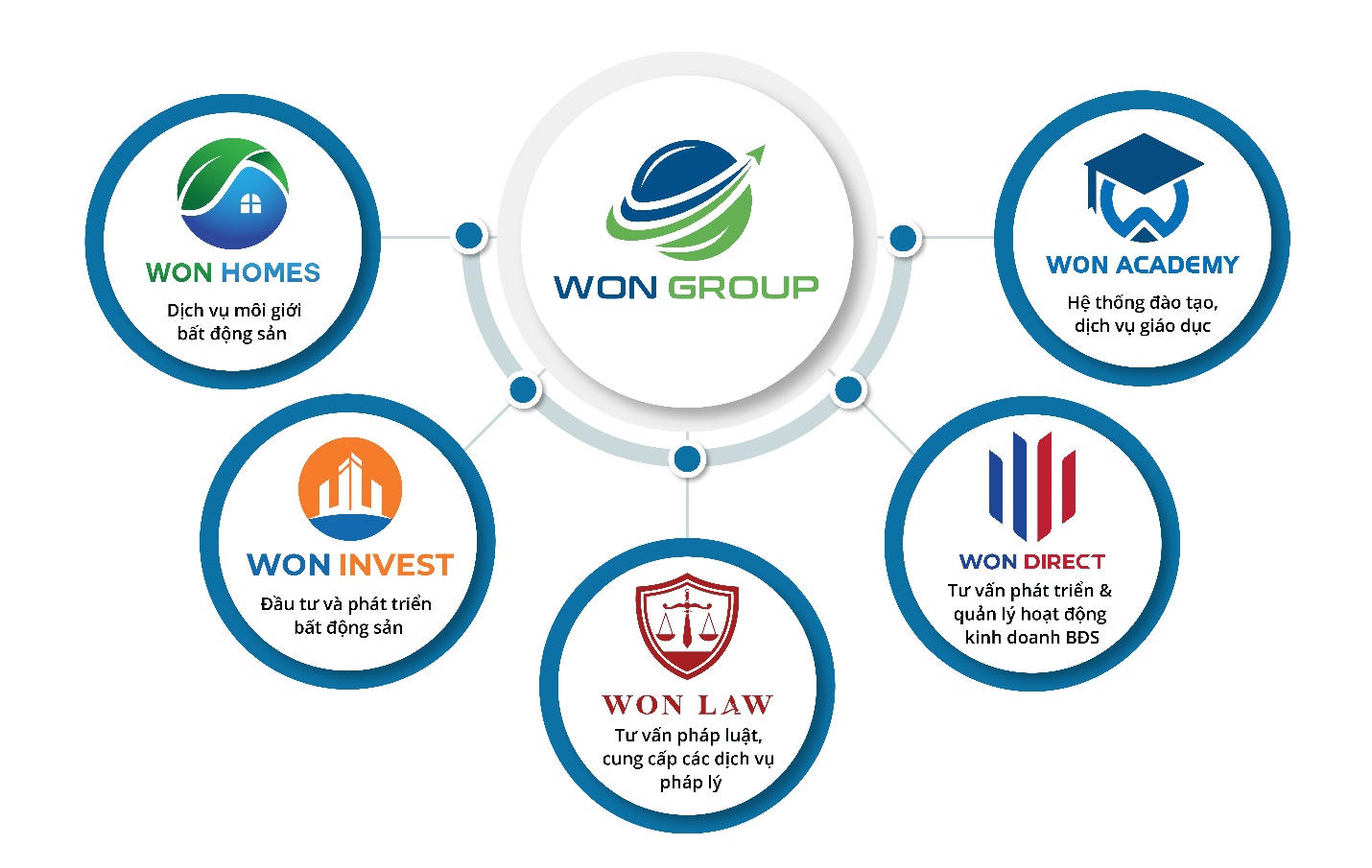 Với chiến lược phát triển linh hoạt, trong suốt 4 năm qua, Won Group đã xây dựng một hệ sinh thái đồng bộ, bao gồm nhiều đơn vị thành viên như: Won Homes, Won Invest, Won Academy, Won Law, Won Direct...