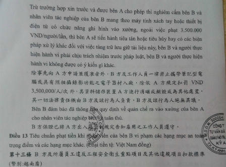 Ngoài ra, hợp đồng cũng quy định: nếu Công ty Môi trường – Đô thị Kỳ Anh không thể tiếp tục thực hiện hợp đồng vì lý do nào đó, Formosa phải thuê bên thứ 3 thay thế thì Công ty môi trường Kỳ Anh phải trả chi phí chênh lệch phát sinh theo đơn giá hợp đồng mà Formosa đã phải chi trả thêm. Và nếu chưa được bên Formosa cho phép thì nhân viên của Công ty môi trường Kỳ Anh không được đưa máy tính xách tay hay các thiết bị điện tử có chức năng ghi hình vào xưởng. Nếu vi phạm thì sẽ bị Formosa xử phạt 3.500.000 VNĐ/người/lần, đồng thời các thiết bị này sẽ bị tiêu hủy.
