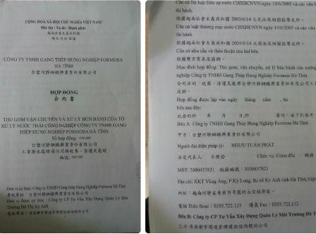 Công ty Môi trường - Đô thị Kỳ Anh kí hợp đồng với Formosa từ tháng 4/2016, công ty này không có chức năng hay được cấp phép để làm việc này. Hợp đồng “Thu gom vận chuyển và xử lý bùn bánh của tổ xử lý nước thải công nghiệp công ty TNHH gang thép Hưng Nghiệp Formosa Hà Tĩnh” có số hợp đồng 1001087, ký ngày 15/3/2016, giữa bên A là Formosa Hà Tĩnh do ông Ngưu Tuấn Phát đại diện và bên B là Cty CP Tư vấn Xây dựng Quản lý Môi trường đô thị Kỳ Anh do ông Lê Anh Tài, Phó giám đốc công ty làm đại diện. Hợp đồng này có 16 trang và phần phụ lục, gồm 14 điều và nhiều điều khoản, thể hiện bằng song ngữ (cả tiếng Việt Nam và Trung Quốc).
