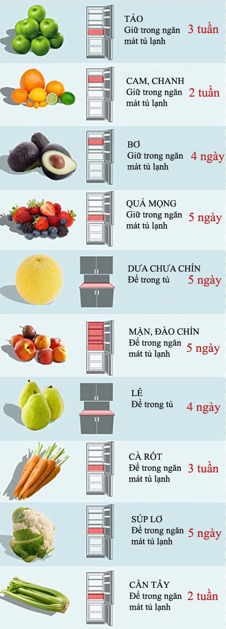'Hạn cuối' bảo quản các loại thực phẩm trong tủ lạnh Táo để ngăn mát tủ lạnh sẽ giữ được độ tươi ngon suốt 3 tuần, trong khi thịt cá sống để ngăn đá sẽ bảo toàn được chất dinh dưỡng lên tới 6 tháng. Thứ Bảy 25/03/2017 09:23 (GMT+7) Cách bảo quản thực phẩm và thời gian để tối đa với từng loại rau, củ, quả: Mô tả ảnh Theo Thế Đan