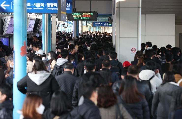 Ga Sindorim thuộc tuyến tàu điện ngầm số 1 và 2 đông kín người hôm 7/11. Ảnh: Yonhap