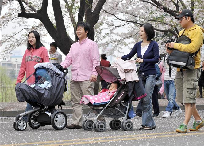 Các ông bố bà mẹ đưa con dạo chơi tại Seoul, Hàn Quốc. Ảnh: AFP/TTXVN