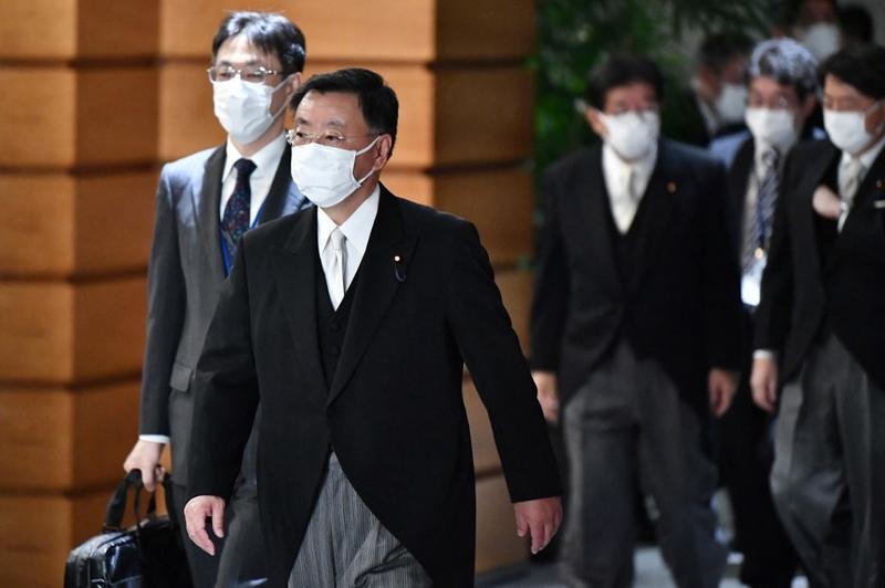 Ông Hirokazu Matsuno, Chánh văn phòng nội các, cùng với những người khác rời văn phòng Thủ tướng sau lễ bổ nhiệm tại Cung điện Hoàng gia ở Tokyo ngày 10/11/2021. Ảnh: AFP