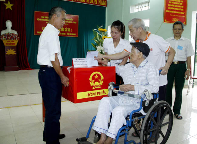 Cử tri Lê Thọ Lâm, 98 tuổi tham gia bỏ phiếu tại khu vực bỏ phiếu số 2, phường Trần Phú, TP. Hà Giang. Ảnh: Báo Hà Giang. |