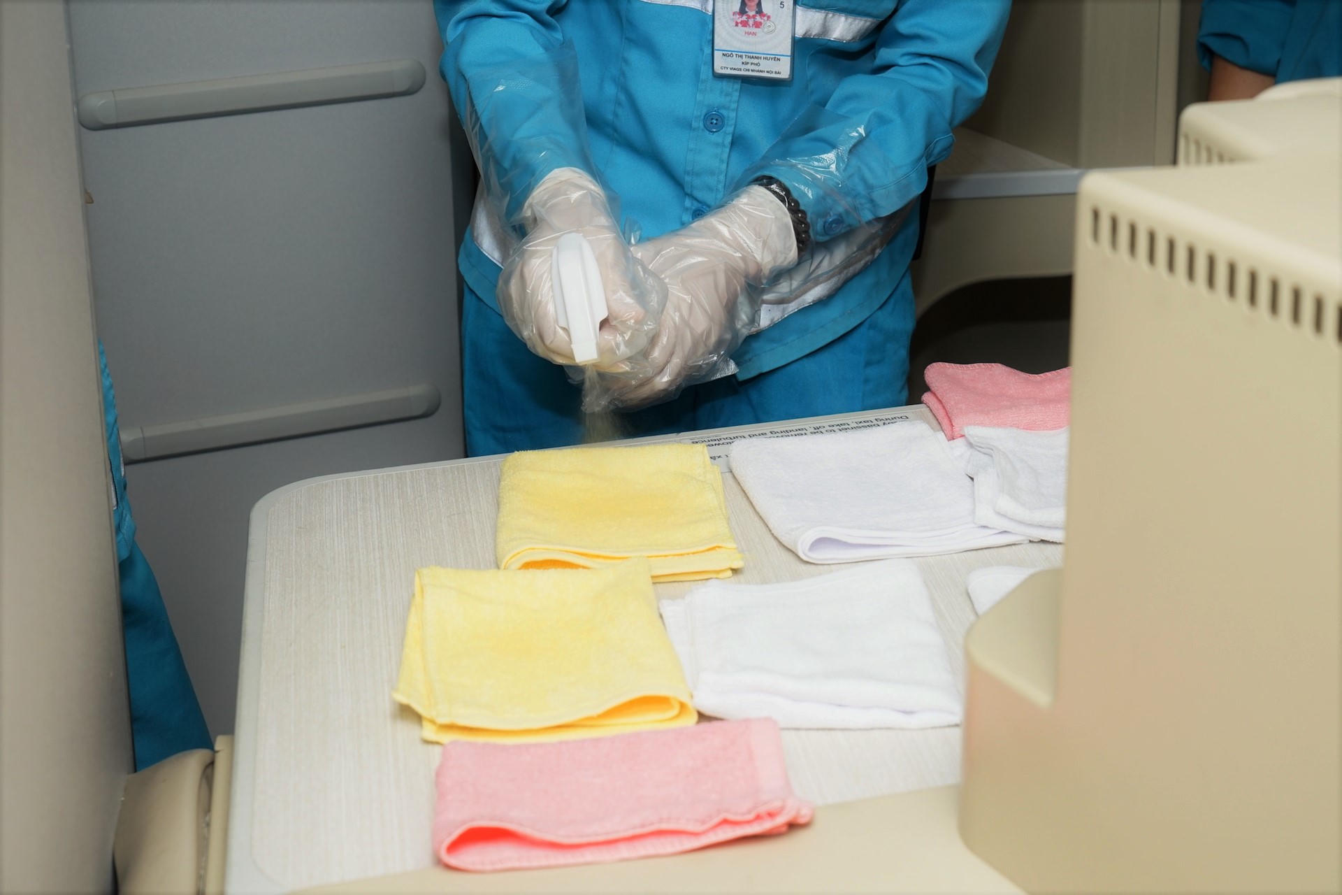 Theo đó, Vietnam Airlines đã chủ động trang bị dụng cụ, hóa chất, triển khai đào tạo và xây dựng quy trình khử trùng gồm hai bước cơ bản là phun khử trùng tàu bay và lau chùi vệ sinh trang thiết bị bằng dung dịch chuyên dụng.