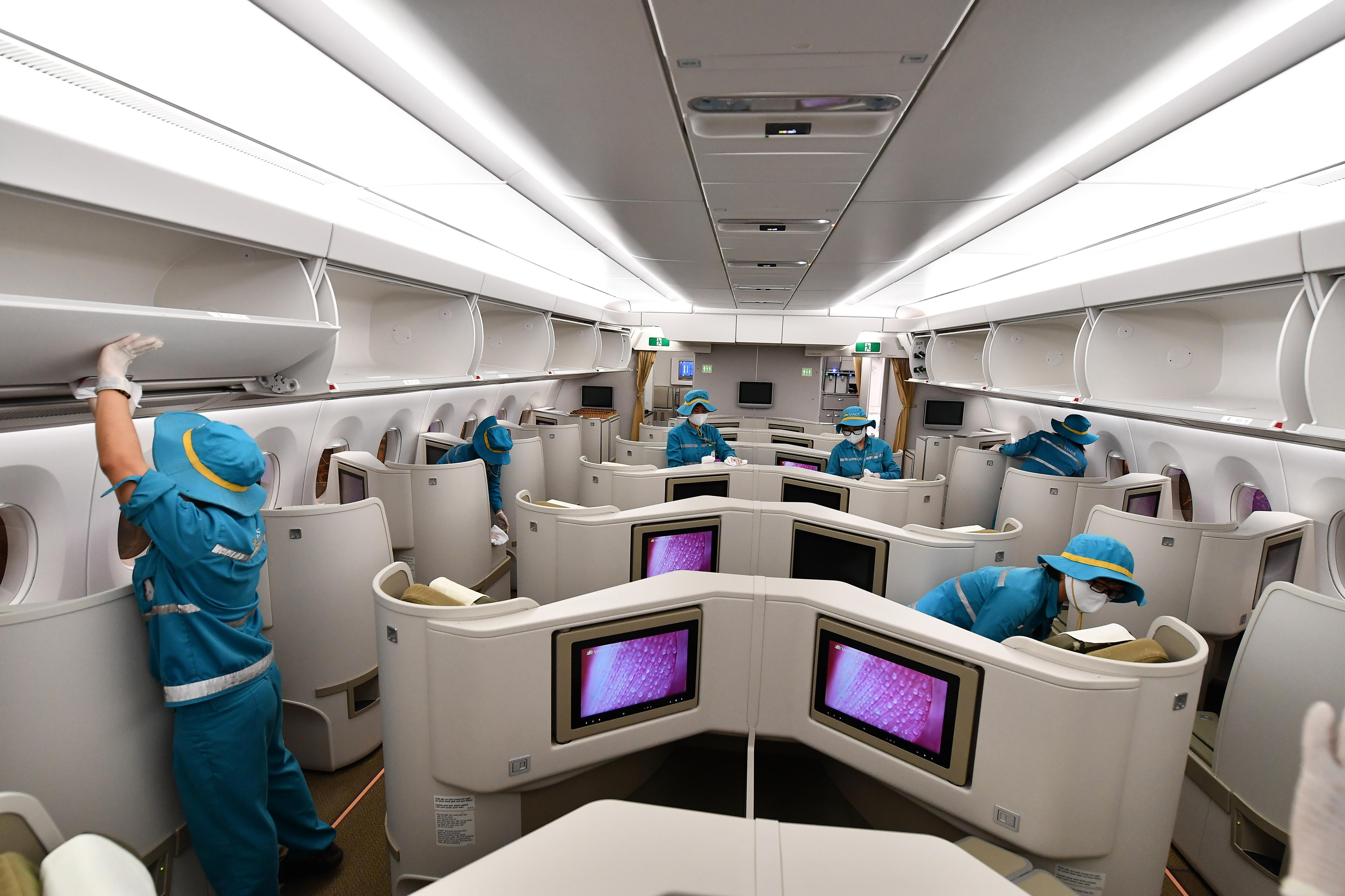 Toàn bộ khu vực khoang hành khách, buồng lái, khu chuẩn bị của tiếp viên đều được khử trùng nghiêm ngặt. Các vị trí, thiết bị được tập trung khử trùng, lau chùi vệ sinh là nơi có nhiều người tiếp xúc bằng tay như khóa ngăn hành lý, thanh tỳ tay trên ghế ngồi, tai nghe, các nút bấm… Ba mươi phút sau khi phun khử trùng và vệ sinh trang thiết bị, tàu bay sẽ được đưa vào khai thác trở lại để phục vụ hành khách.
