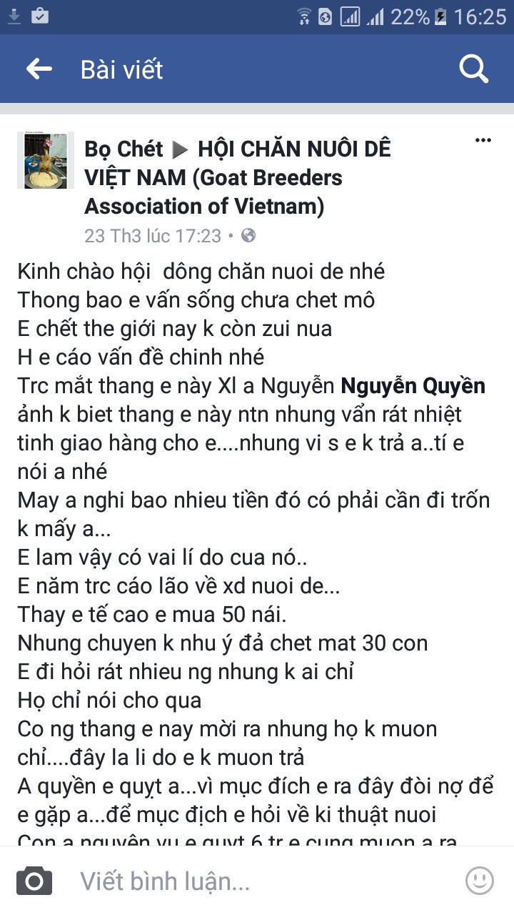 (PLO) -Thời gian gần đây, trên diễn đàn Hội Chăn nuôi dê Việt Nam, nhiều người phản ánh họ bị chủ nhân Facebook “Bọ Chét” (trước đây có nickname Lò Mổ Dê) quỵt tiền mua dê. Trước sự bất bình của các nạn nhân, “Bọ Chét” lên facebook thông báo mình lâm nợ và kêu gọi giúp đỡ. Thậm chí, y còn giả giọng tung tin mình đã chết nhưng sau đó lại quay trở lại diễn đàn dọa dẫm, khiêu khích các nạn nhân.