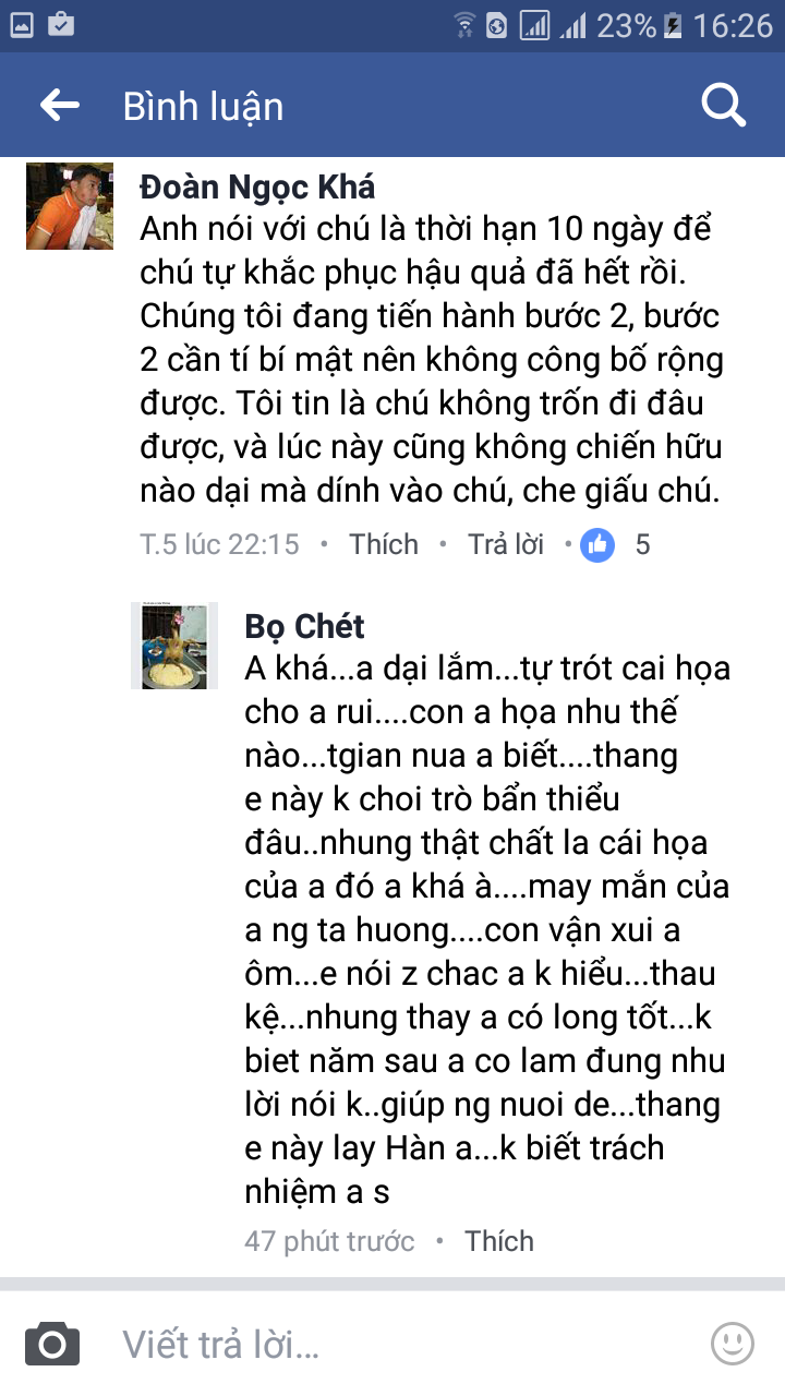 “Bọ Chét” đăng trên facebook: “...Anh Quyền, em quỵt tiền anh vì mục đích anh ra đây đòi nợ để em gặp anh, em hỏi kỹ thuật nuôi”, “...Em nghĩ nói mình chết là mấy anh chạy ra ngay để đòi tiền, đến giờ (mấy anh) vẫn không ra”... “Bọ Chét” còn hẹn: “Mai em đi Lào... khoảng 6 tháng đến 1 năm em về, các anh cứ tính lãi 5% cho em.