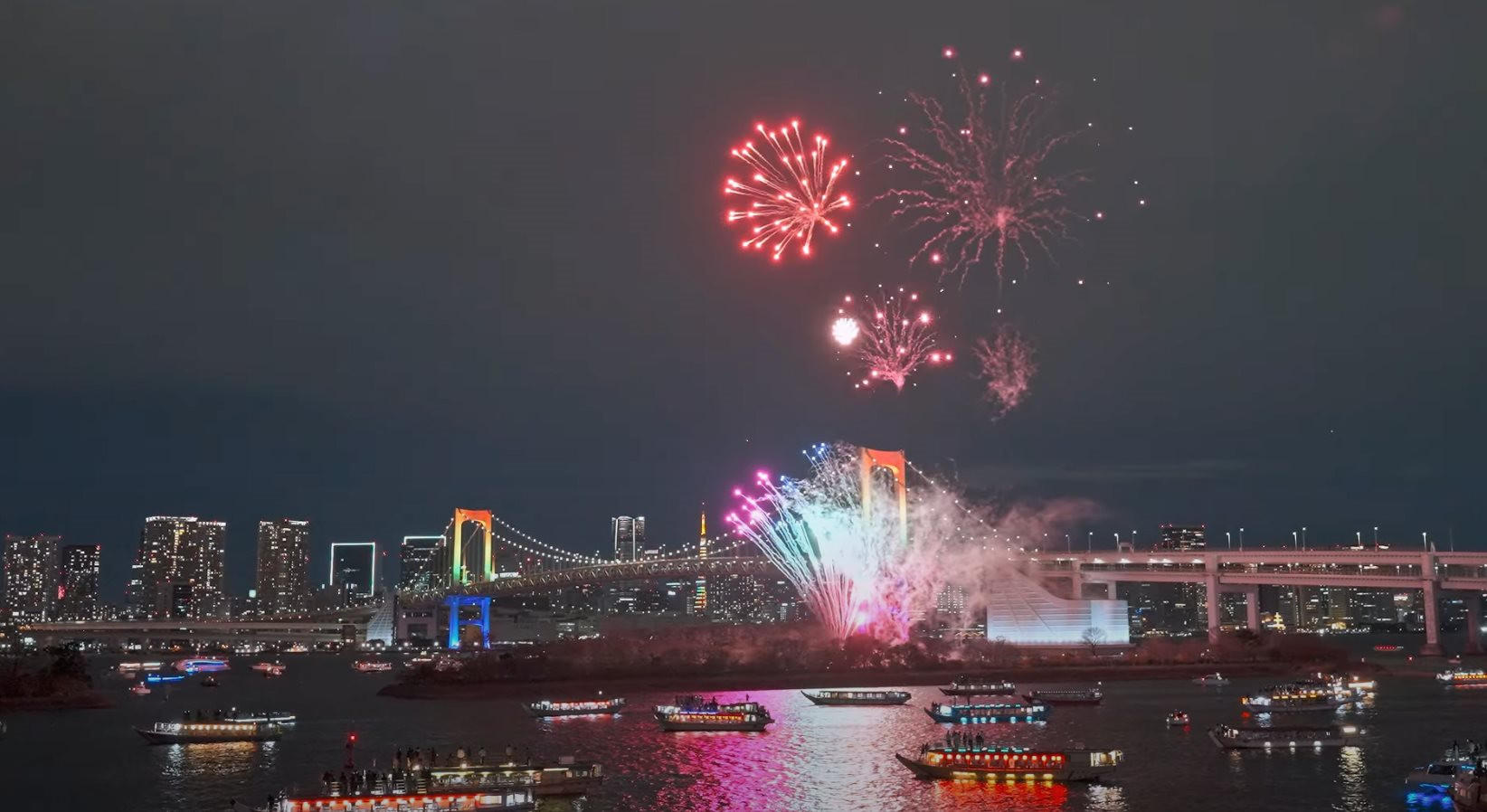 Màn pháo hoa rực rỡ trên cầu Rainbow (cầu vồng) tại Thủ đô Tokyo.