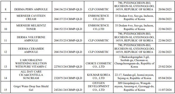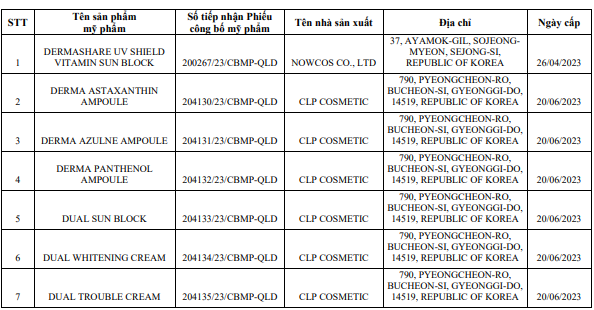 Cụ thể, Cục Quản lý Dược thu hồi 15 số tiếp nhận phiếu công bố sản phẩm mỹ phẩm do Công ty TNHH Thương mại & Du lịch Văn Hiến (địa chỉ Số 05, ngách 124/32, đường Do Nha, phường Tây Mỗ, quận Nam Từ Liêm, TP Hà Nội) đưa ra thị trường. 15 sản phẩm này bao gồm các mỹ phẩm chăm sóc da, kem chống nắng, được sản xuất từ Hàn Quốc.