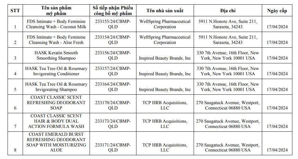 Ngoài ra, Cục Quản lý Dược còn thu hồi 19 số tiếp nhận phiếu công bố sản phẩm mỹ phẩm do Công ty cổ phần 361 Việt Nam (địa chỉ NO7B-LK35 Khu đất dịch vụ LK6,LK7,LK10,LK11, phường Vạn Phúc, quận Hà Đông, TP Hà Nội) chịu trách nhiệm đưa ra thị trường. 19 loại mỹ phẩm này là sản phẩm nhập khẩu từ Mỹ, gồm sữa rửa mặt, kem dưỡng da, dầu gội đầu, sữa tắm...
