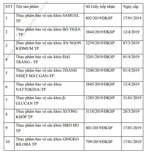 Trong đó có 10 sản phẩm thực phẩm bảo vệ sức khỏe do Công ty Cổ phần Dược phẩm Trumpharmaco (địa chỉ: Số 36 ngõ 23 phố Nhật Tảo, phường Đông Ngạc, quận Bắc Từ Liêm, thành phố Hà Nội, Việt Nam) công bố.