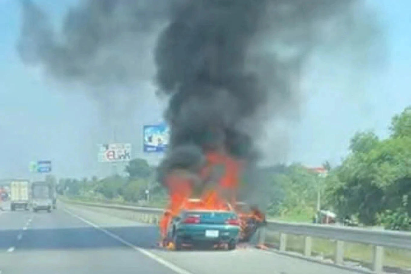 Ô tô bốc cháy dữ dội trên cao tốc (Ảnh: Dân trí). |