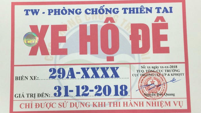 Trao đổi với báo chí chiều 25/9, ông Trần Quang Hoài, Tổng Cục trưởng Tổng Cục Phòng chống thiên tai cho biết, biển "xe hộ đê" được cấp cấp cho lãnh đạo Ban Chỉ đạo T.Ư về phòng chống thiên tai, lãnh đạo các bộ, ngành, cơ quan T.Ư là thành viên của Ban Chỉ đạo T.Ư về phòng chống thiên tai; lãnh đạo một số địa phương và lực lượng chuyên trách tham gia hộ đê, cứu đê gồm công an và quân đội. Biển được cấp dành cho xe công vụ, chứ không phải loại xe cá nhân.