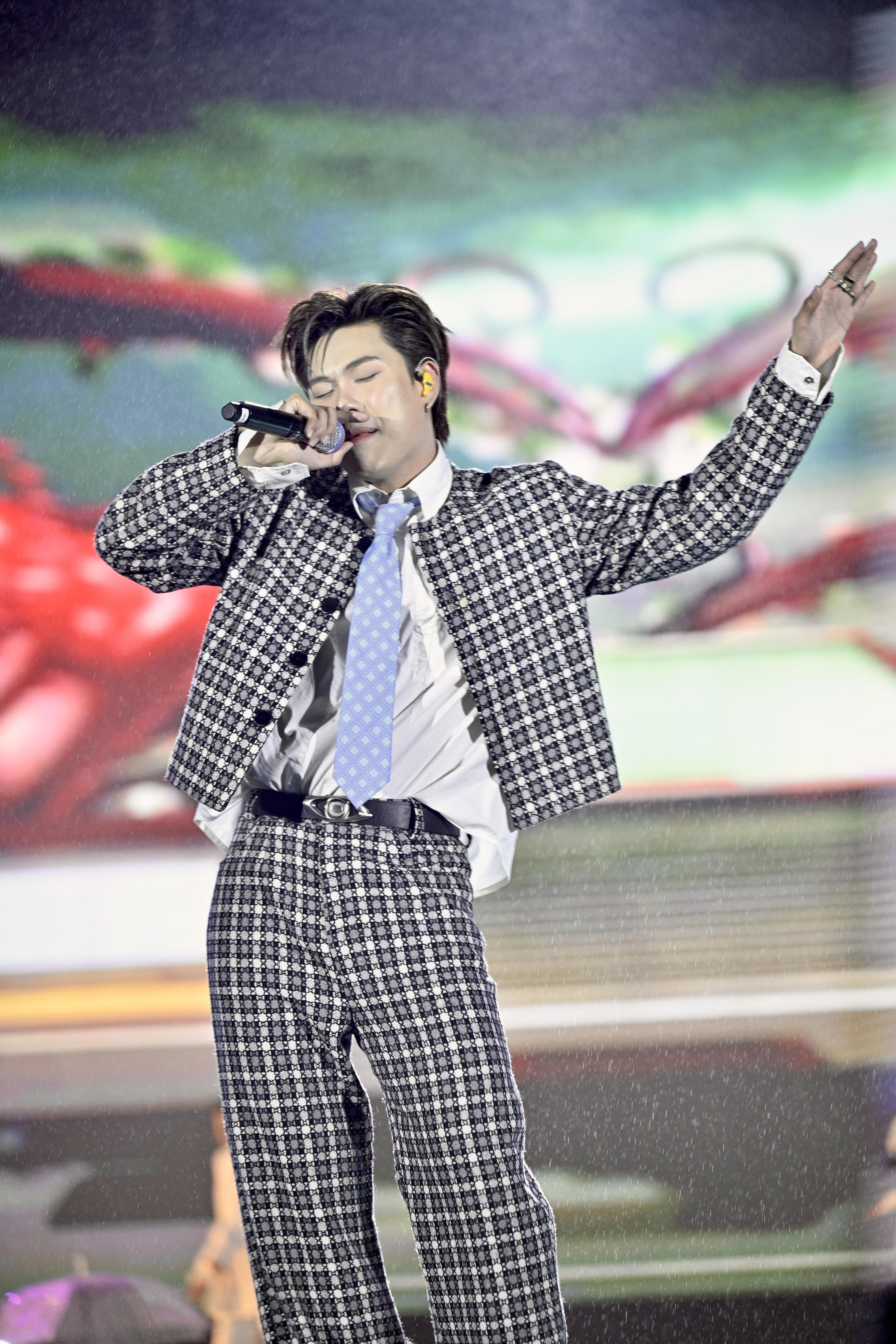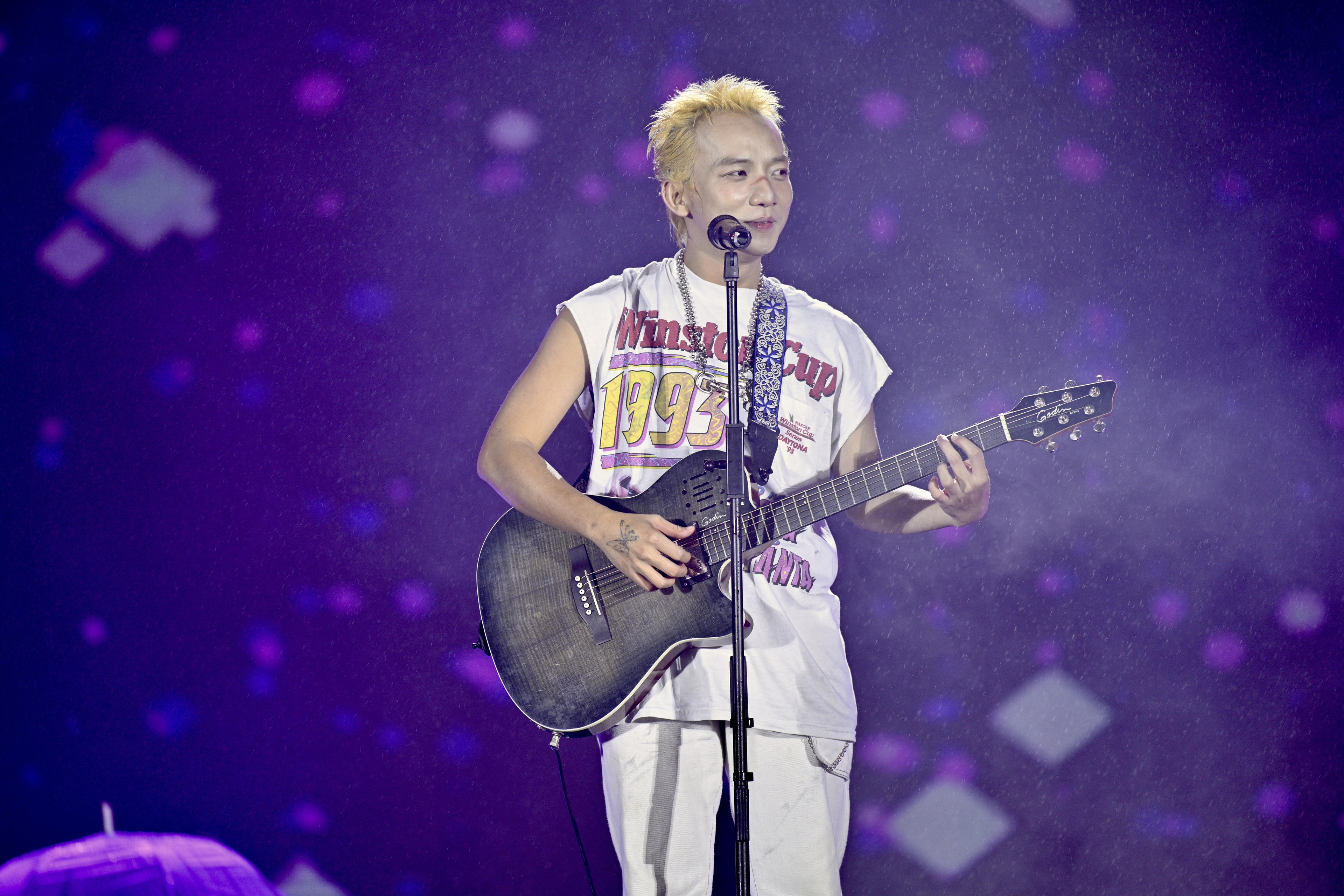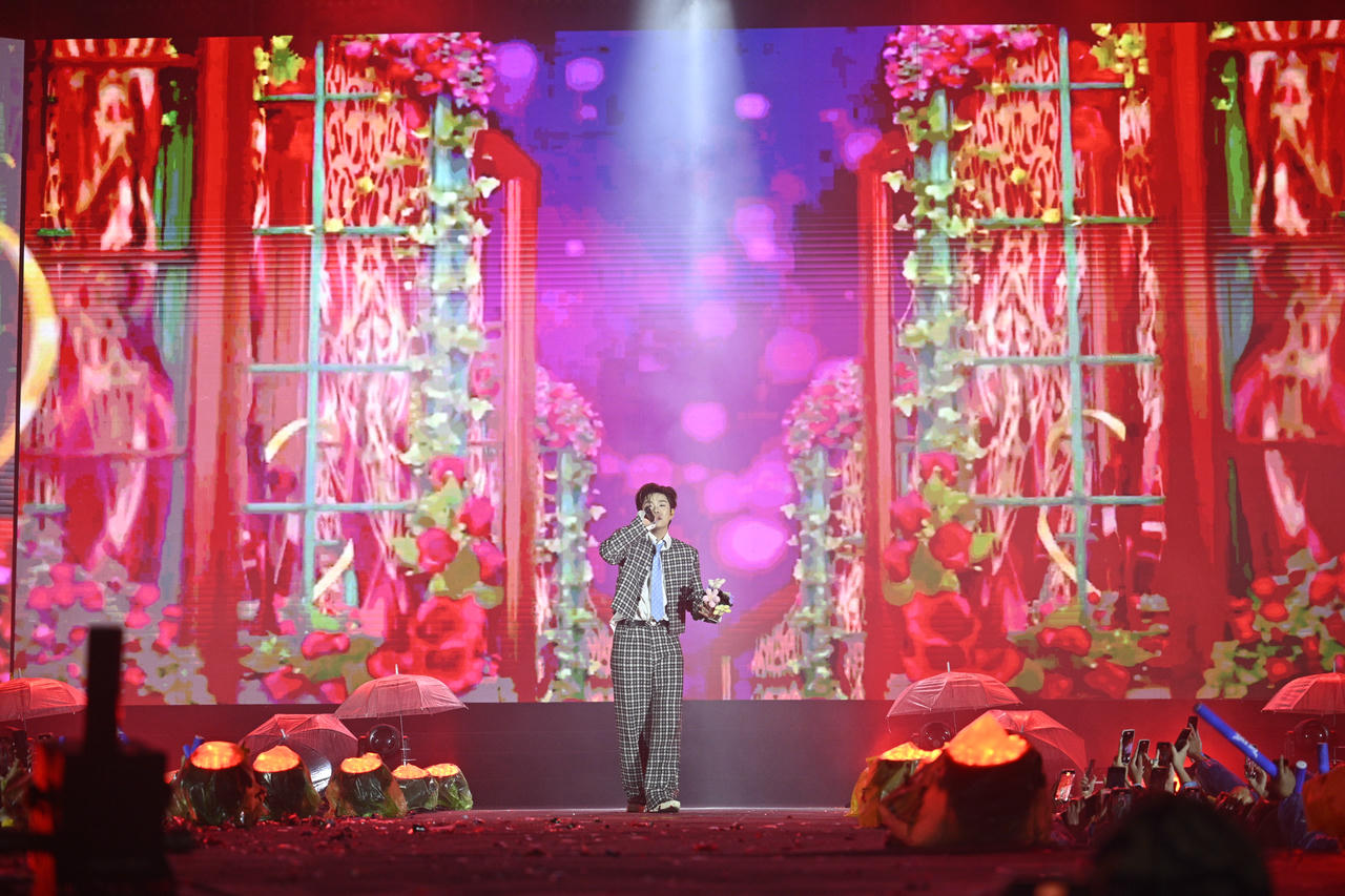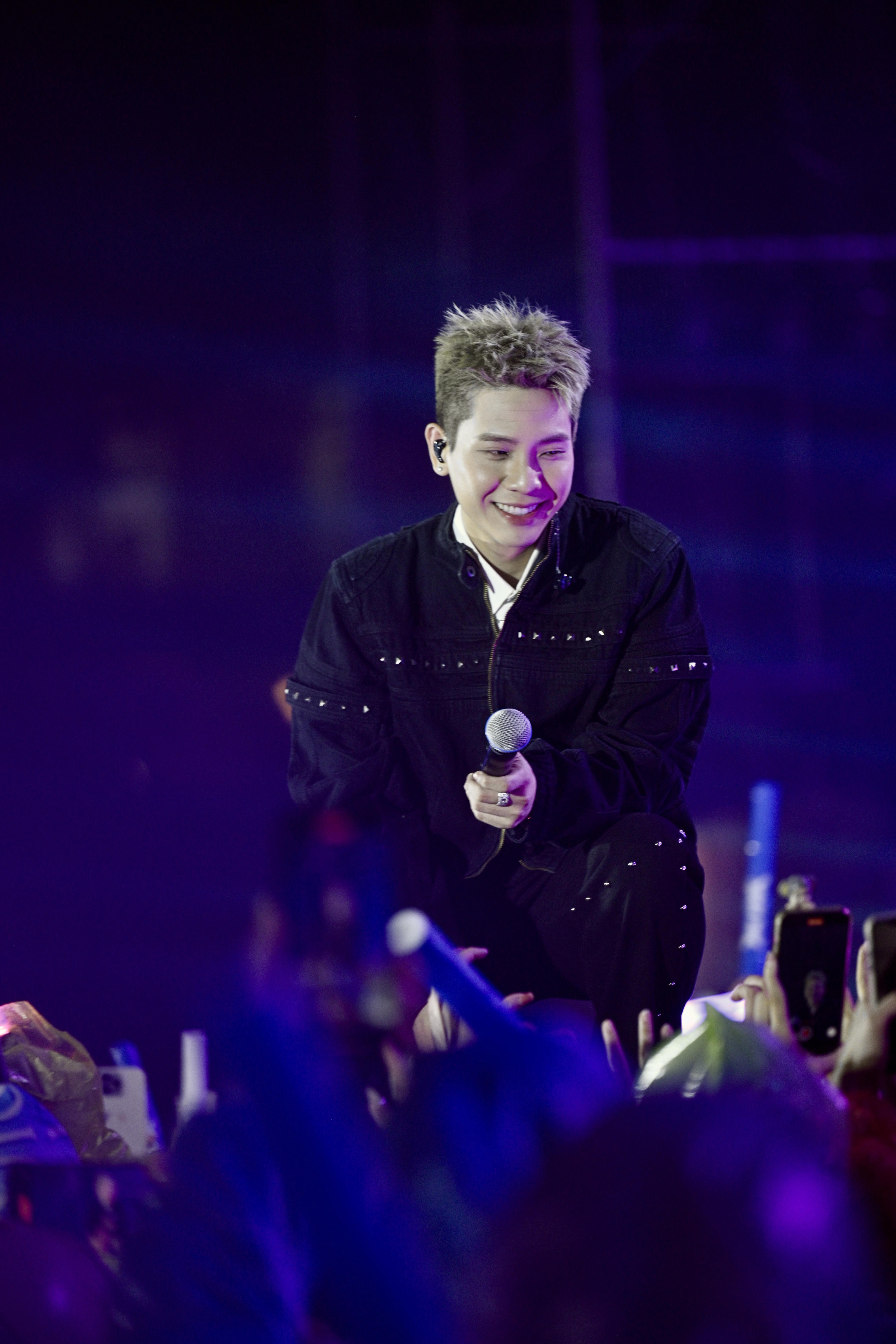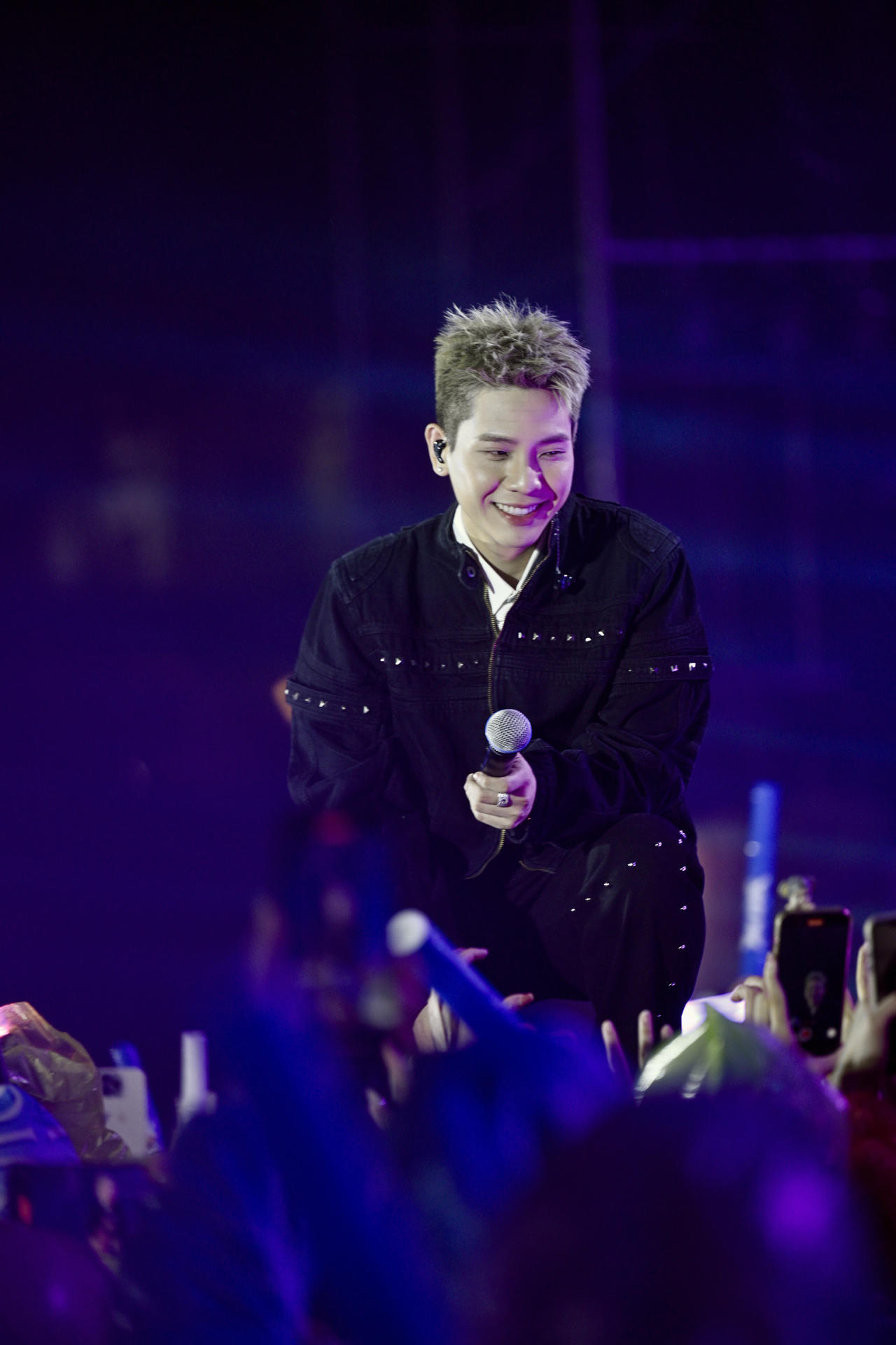 Ca sĩ Dương Domic "cháy" hết mình dưới mưa cùng hàng ngàn khán giả. |
