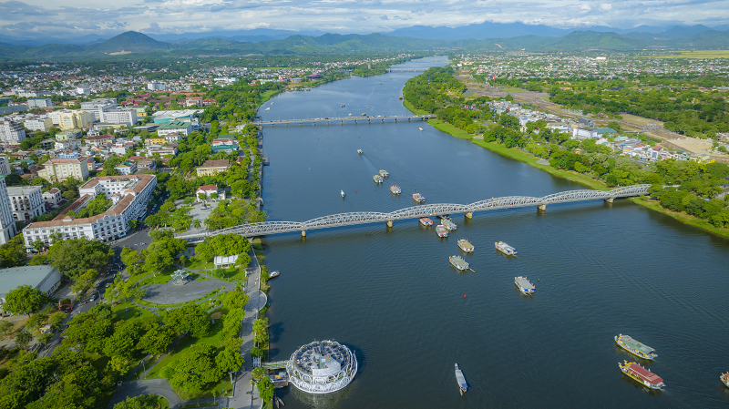 Hàng chục thuyền rồng nối đuôi nhau trên sông Hương đi lên điện Huệ Nam ở xã Hương Thọ, TP Huế |