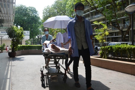 Tại bệnh viện Bạch Mai, chiều ngày 21/5 trên hành lang bệnh viện người nhà bệnh nhân chen nhau tìm chỗ mát để trải chiếu. Sân bệnh viện, dưới gốc cây, ghế đá đều chật kín người. Nhiều người còn trải chiếu, mắc võng dưới gốc cây, tích nước đá để tránh khát.