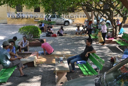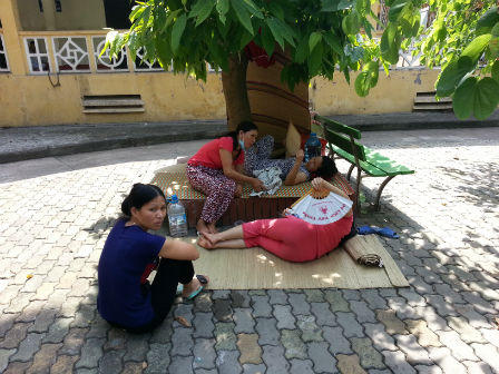 Còn chị Nguyễn Thị Thu (Duy Tiên, Hà Nam) đi trông mẹ bị bệnh tim cũng vạ vật ở ngay sân bệnh viện. Chị kể buổi sáng nắng nôi nhẹ thì ngồi trên hành lang còn buổi chiều phải trải chiếu qua gốc cây nằm, đêm ngủ luôn ở gốc cây và chỉ có quạt nan. “Không biết bao giờ mẹ mới được ra khỏi phòng cấp cứu để đi thuê trọ chứ tạm bợ thế này mà thời tiết nắng nóng vất vả lắm”, chị Thu ngậm ngùi.