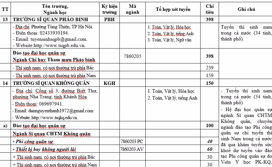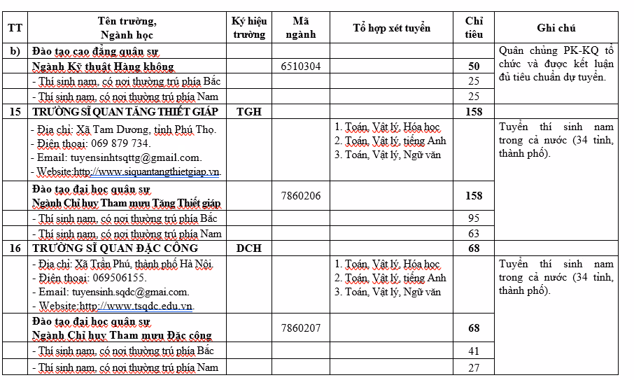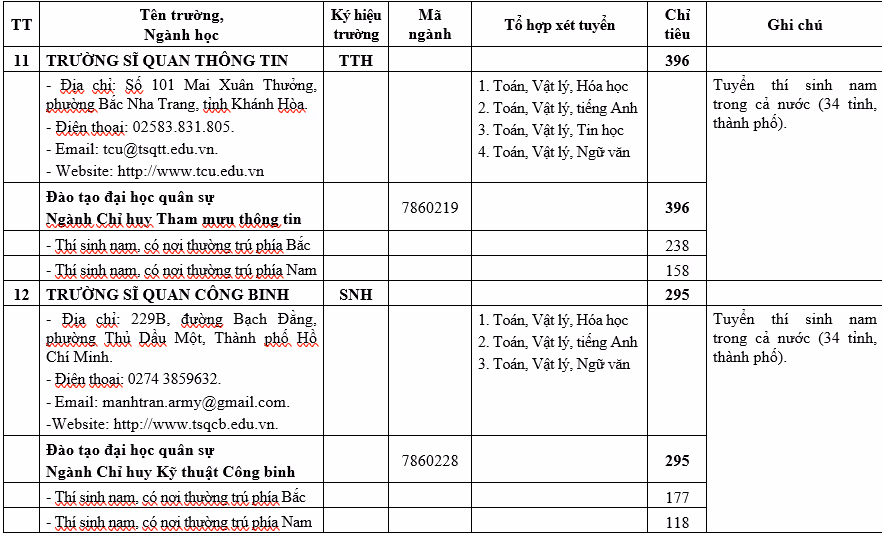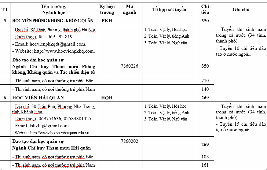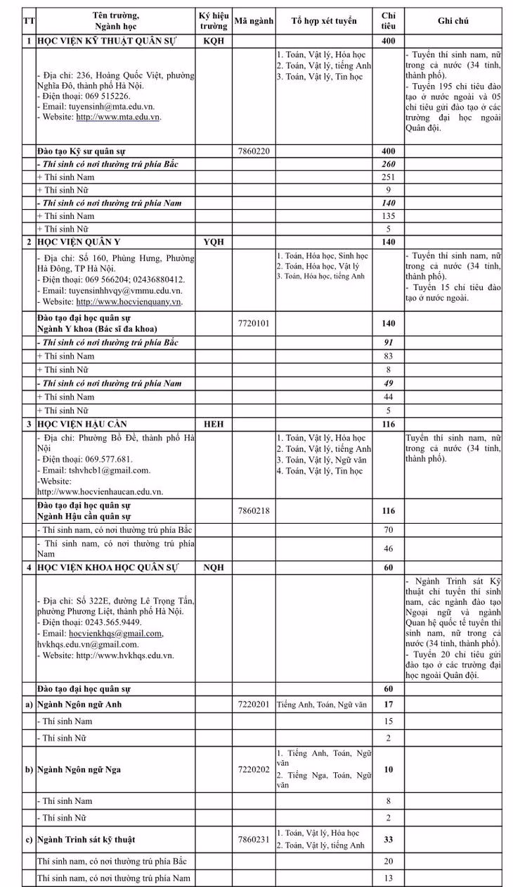 Chỉ tiêu 23 trường quân đội cụ thể như sau: