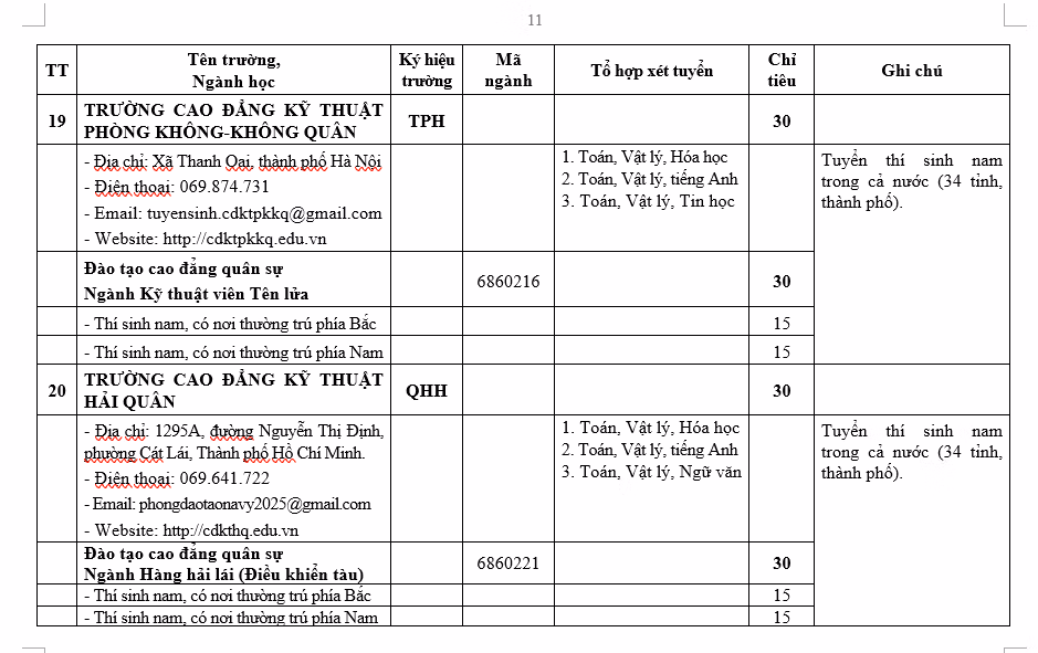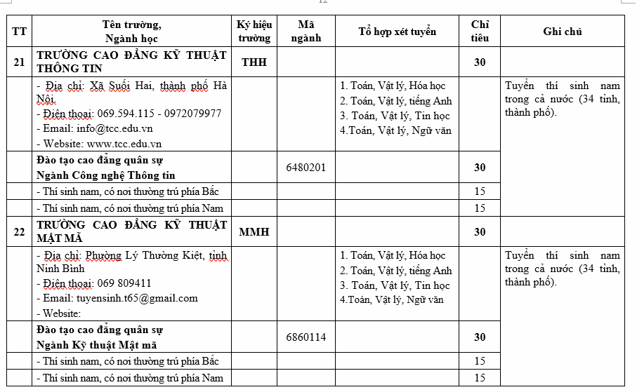 Có 5 trường cao đẳng được giao tuyển 30 học viên/trường, gồm: Trường cao đẳng Kỹ thuật Phòng không - Không quân, Trường cao đẳng Kỹ thuật Hải quân, Trường cao đẳng Kỹ thuật Thông tin, Trường cao đẳng Kỹ thuật Mật mã, Trường cao đẳng Công nghiệp Quốc phòng.