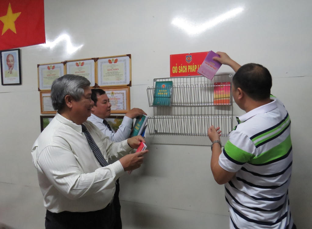 Cục trưởng Cục Công tác phía Nam - Bộ Tư Pháp và Phó Chủ tịch tỉnh Bình Dương trao “Giỏ sách pháp luật” cho một doanh nghiệp trên địa bàn thị xã Bến Cát.