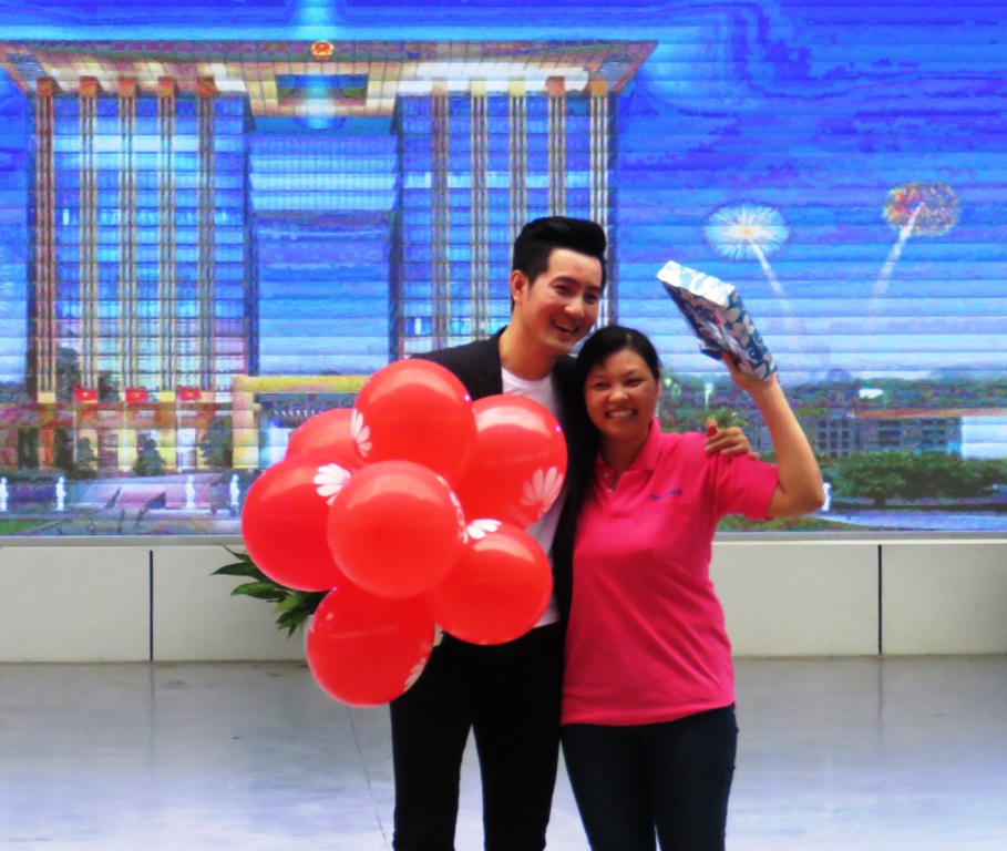 Nhiều công nhân chụp hình với ca sĩ Nguyễn Phi Hùng biểu diễn trong chương trình