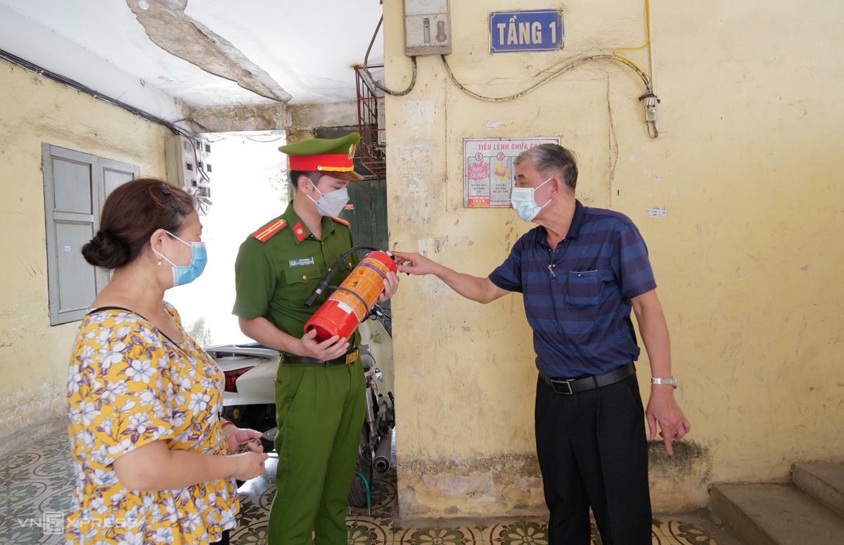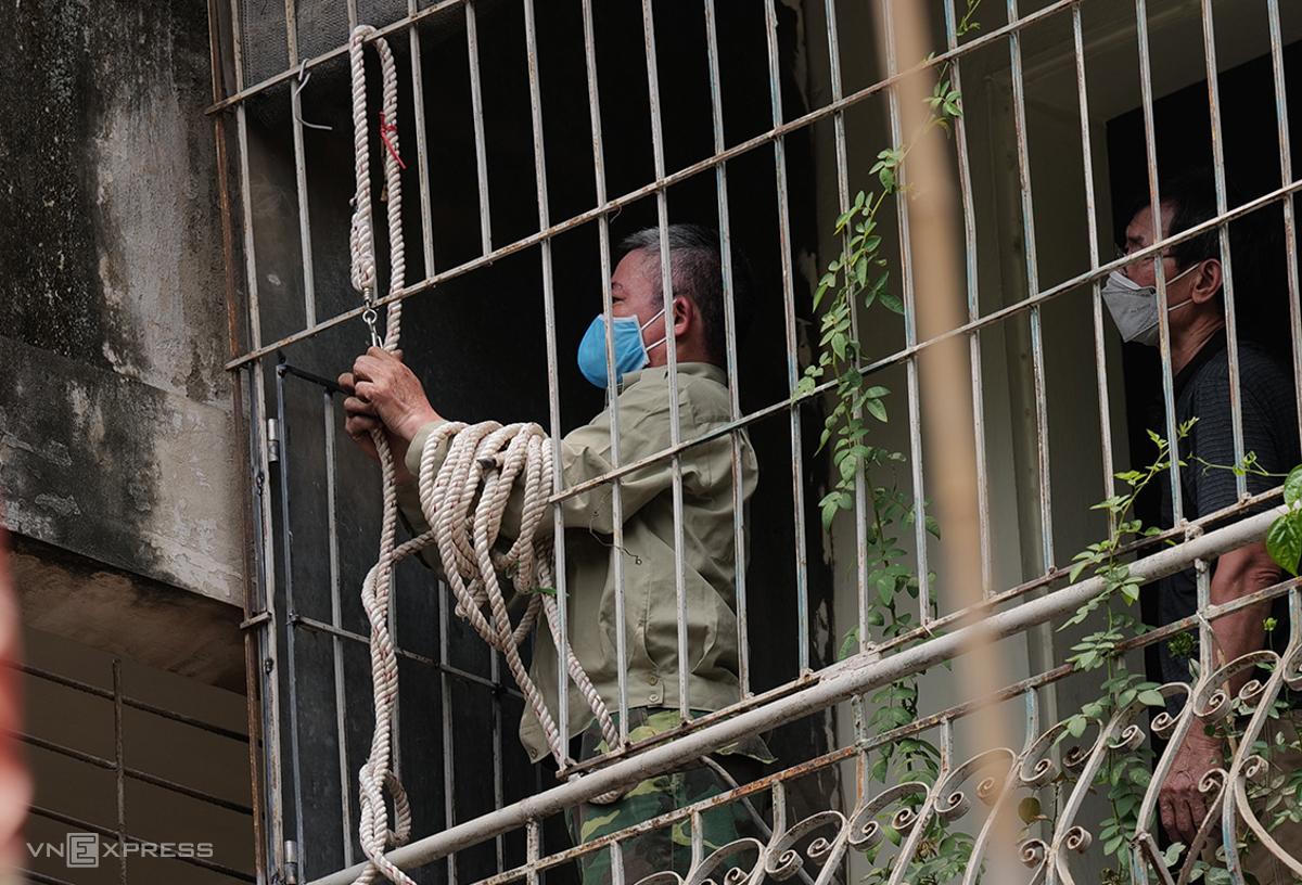 Tổ dân phố và cán bộ UBND phường cùng Công an phường vận động người dân mua thang, dây để thoát hiểm khi xảy ra hỏa hoạn. Chi phí cho mỗi hộ 300.000-400.000 đồng.