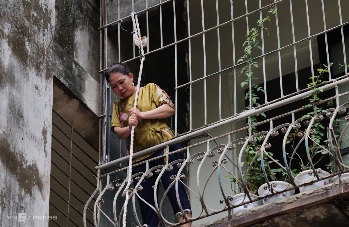 Gia đình là một trong những hộ dân đầu tiên mở lối thoát hiểm khi chính quyền vận động. Cả gia đình ba thế hệ nhà bà Tầm đều biết các thao tác thoát hiểm qua lối mở ở lồng sắt, nắm rõ vị trí để chìa khóa mở cửa lồng. Bà còn sắm thêm dây thừng chịu tải lớn để dễ dàng đu xuống dưới.