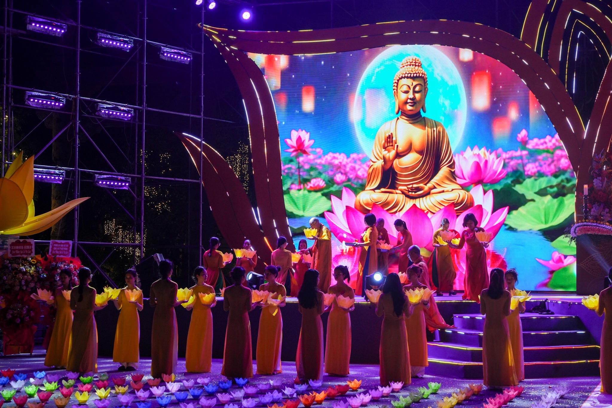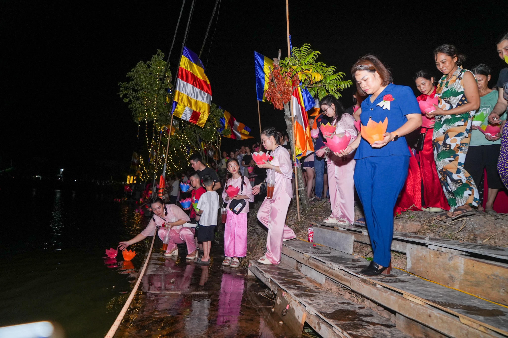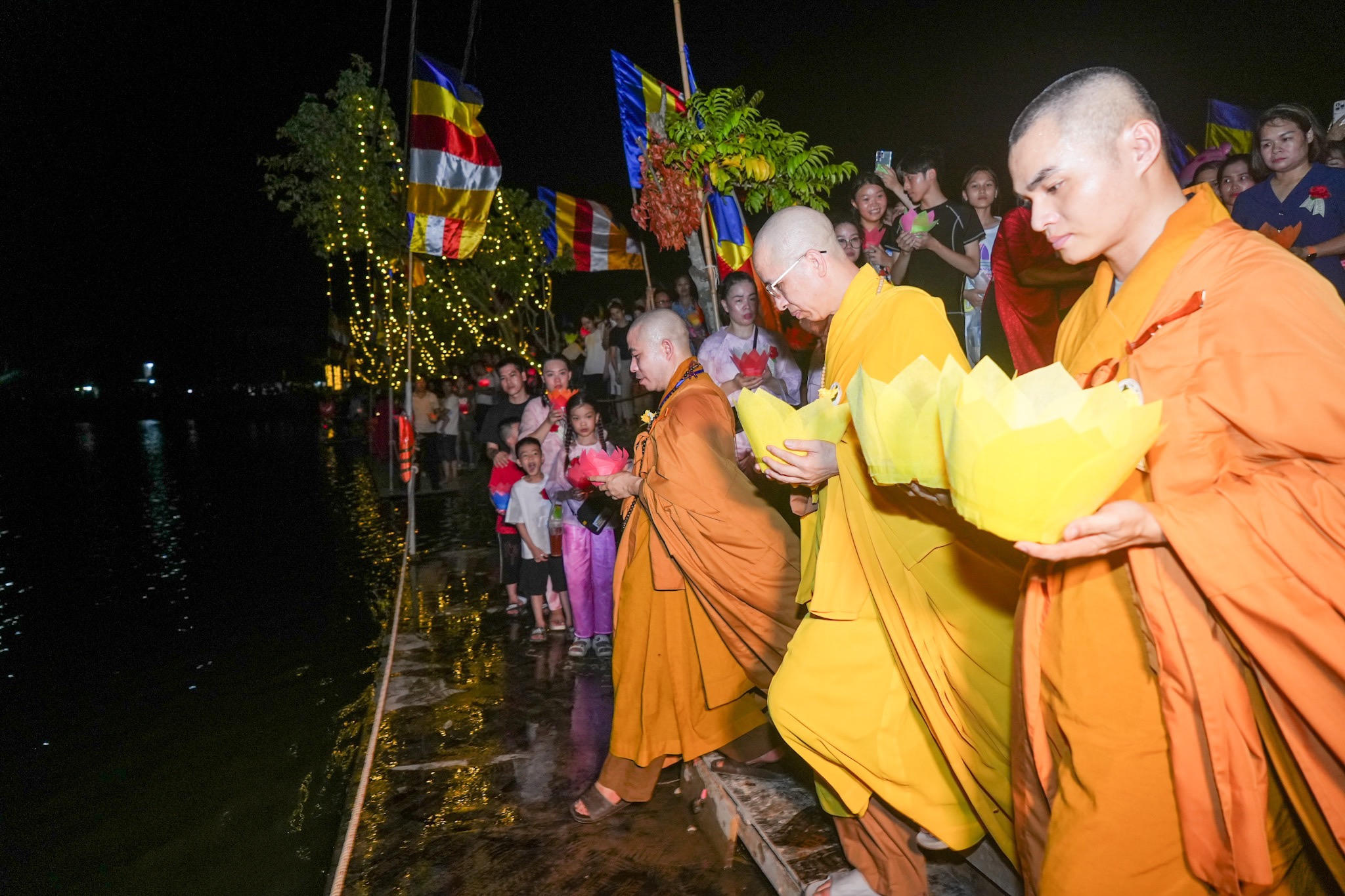 Các chư tăng, phật tử thả hoa đăng. |