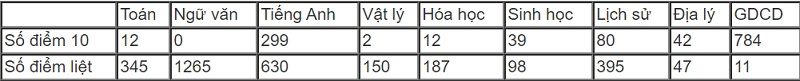 Trong tổng số 1.287 điểm 10 các môn, Giáo dục Công dân có tới 784 bài thi; Tiếng Anh đứng thứ hai với 299 bài; Lịch sử xếp thứ ba với 80 bài.