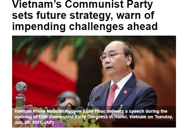 Cũng trong ngày 26/1, hãng tin AP của Mỹ có bài viết “Đảng Cộng sản Việt Nam đề ra chiến lược trong tương lai, dự báo về những thách thức phía trước”.