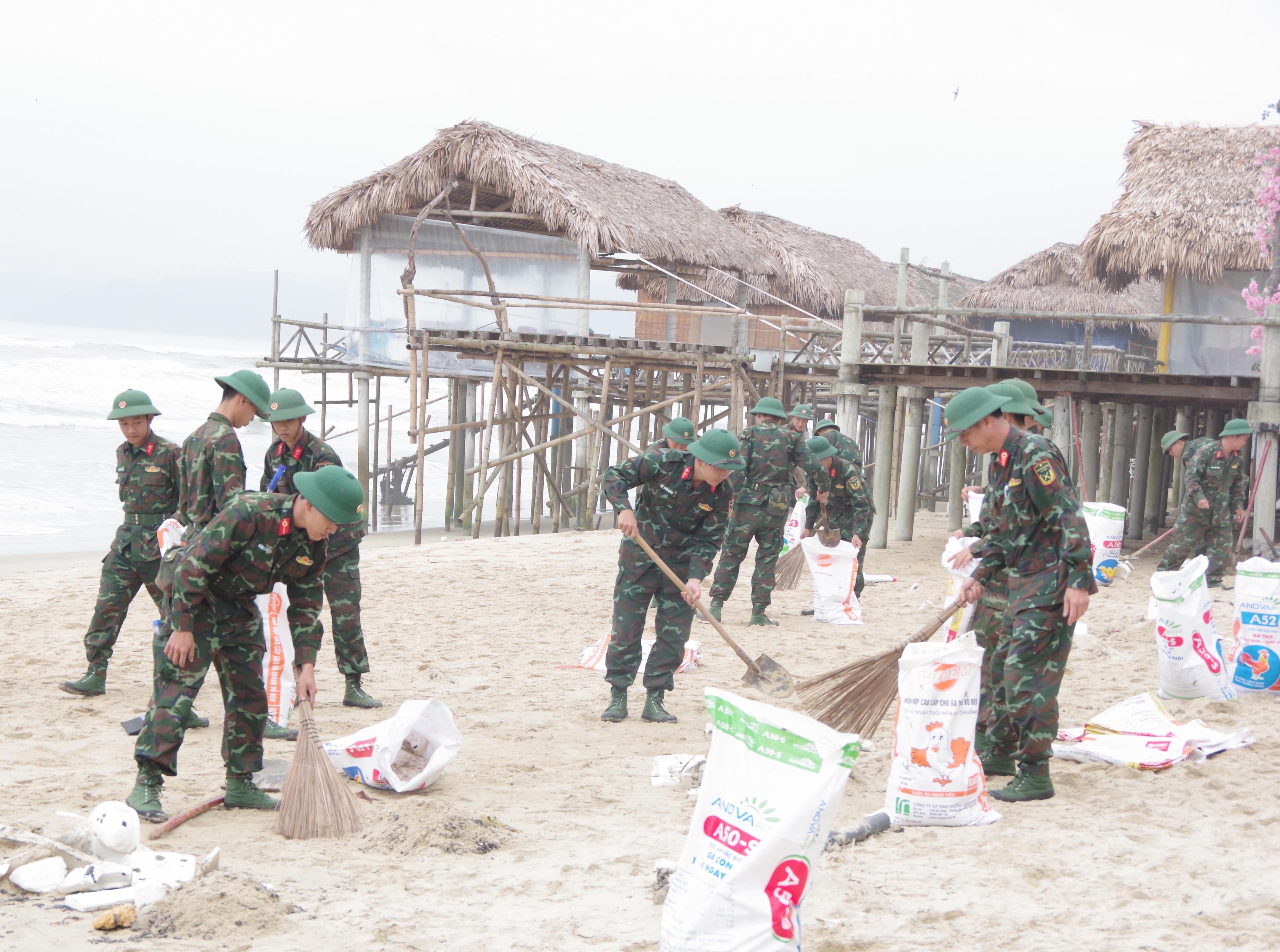 Để nhanh chóng giúp địa phương xử lý sự cố ô nhiễm môi trường biển, hơn 100 cán bộ, chiến sĩ Bộ CHQS TP Huế và hàng trăm chiến sĩ dân quân tự vệ cùng với các lực lượng địa phương đã được huy động để khẩn trương thu gom lượng dầu và rác thải dọc bờ biển.