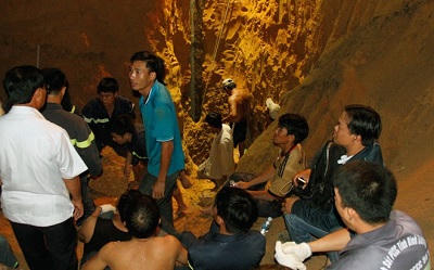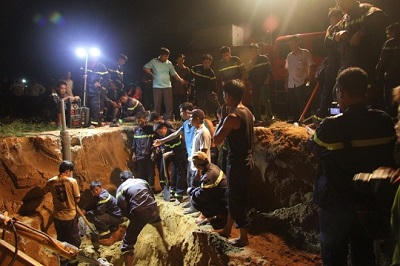 Vì vị trí bé Tú Anh bị mắc kẹt sâu cả chục mét nên lực lượng cứu hộ phải khéo léo đào đất lên để đất không sụp lún lên người bé. Tới khoảng 22h cùng ngày, lực lượng chức năng đã đào được khoảng 7 m. Hiện sức khỏe em bé tương đối tốt, vẫn có thể nghe rõ và trả lời lực lượng cứu hộ phía trên. Ảnh: Báo Bình Dương.