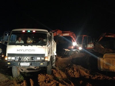 Do lượng đất đào quá nhiều nên lực lượng chức năng phải cho xe ben vào vận chuyển. Ảnh: Báo Bình Dương.