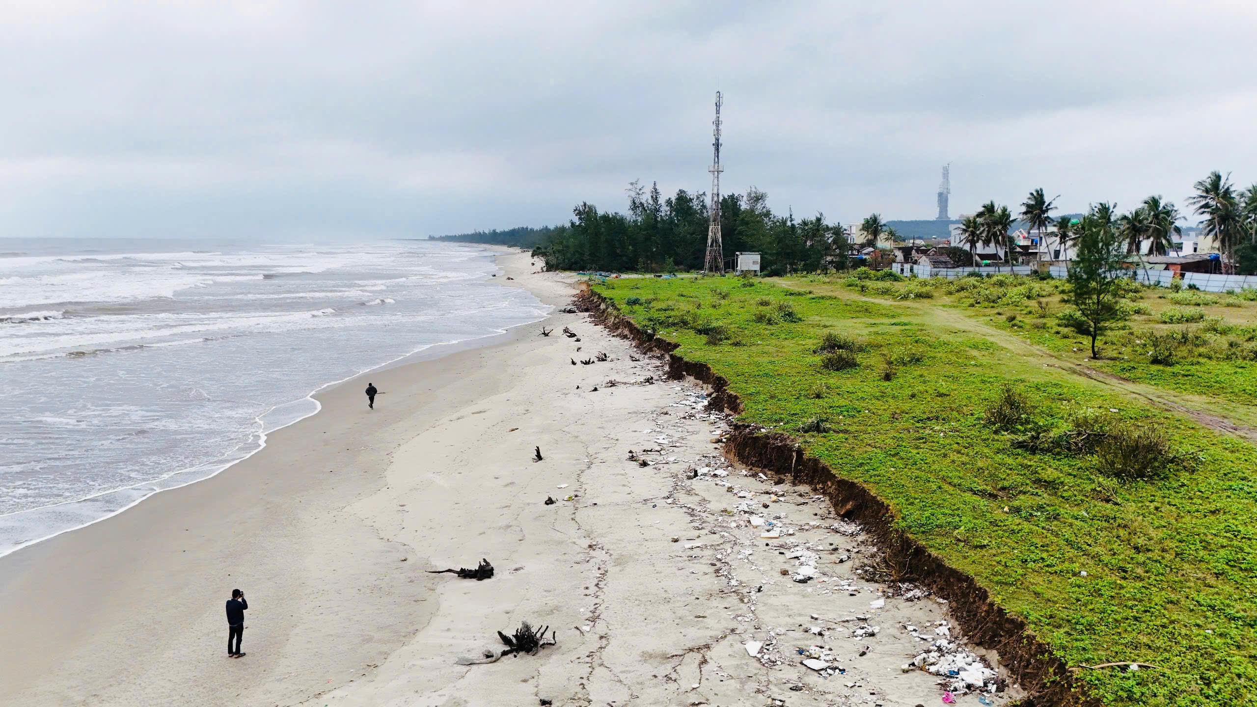 Theo ghi nhận của PV, mức độ sạt lở tại bờ biển Mỹ Khê đã gia tăng nghiêm trọng so với thời điểm trước đây. Sóng lớn đánh vào sát bờ gây sạt lở kéo dài khoảng 1km và có nguy cơ tiếp tục sạt lở sâu vào đất liền.