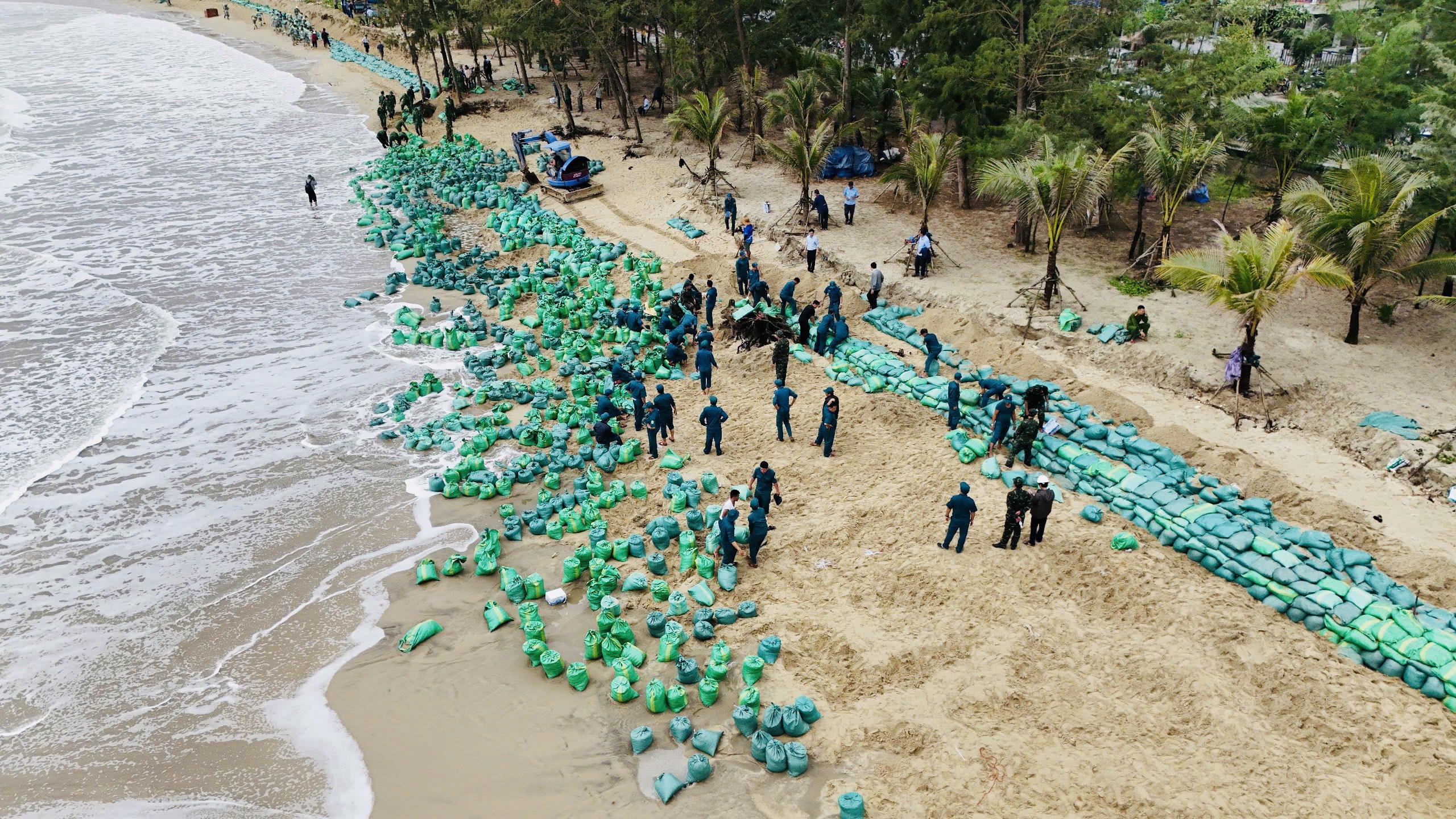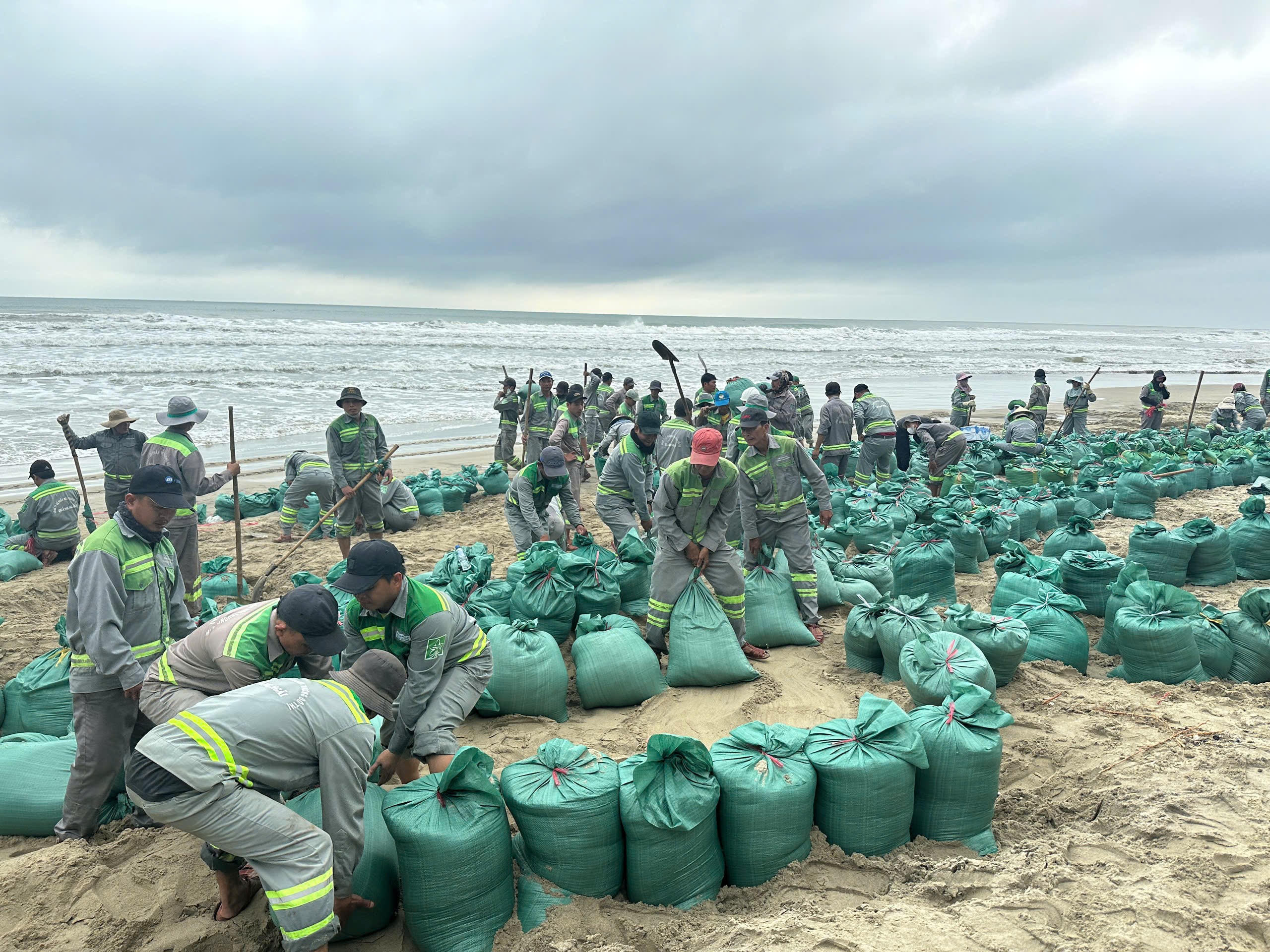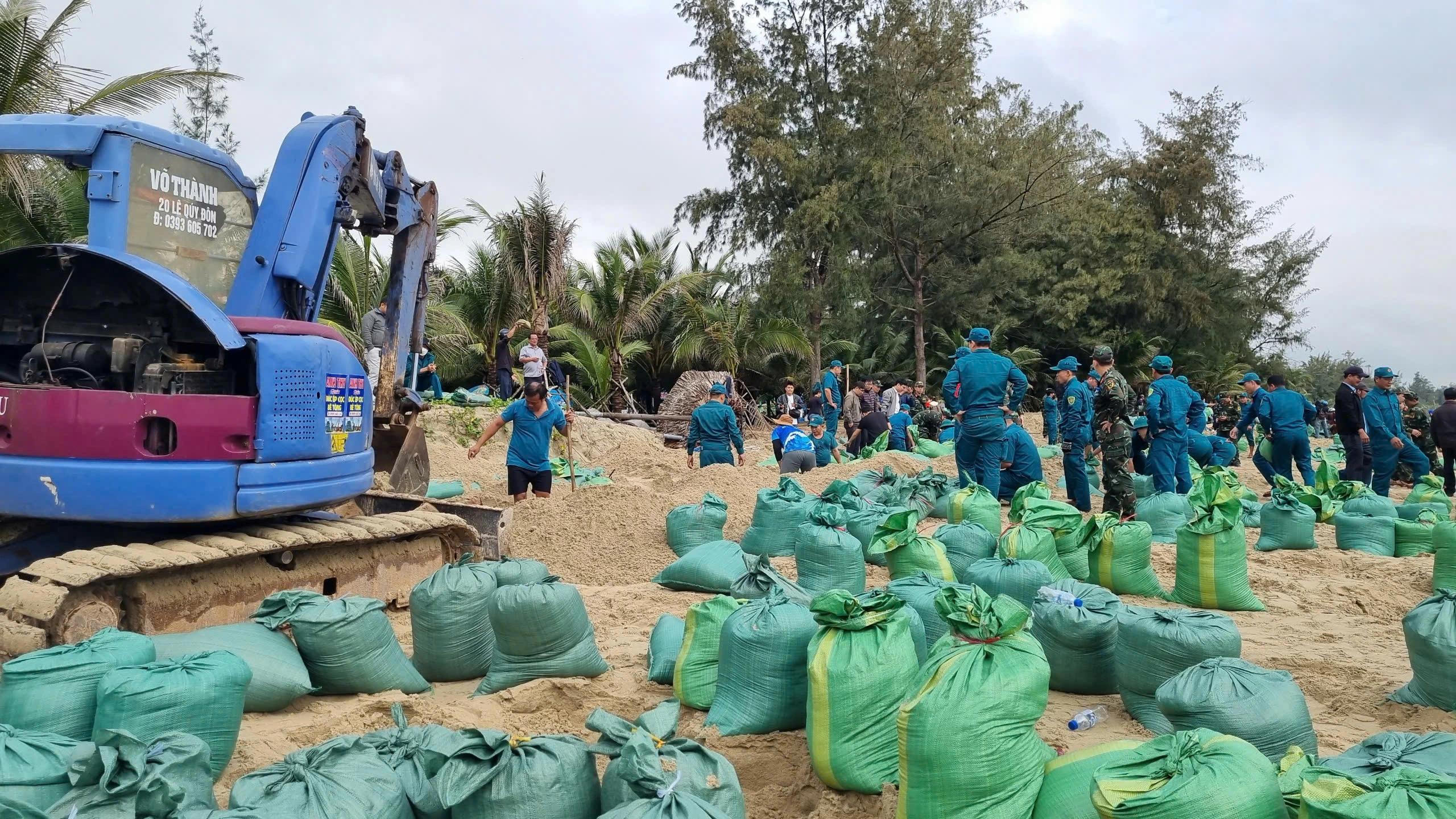 Các đơn vị phân chia khu vực, tổ chức đổ cát vào bao rồi xếp dọc theo bờ biển nhằm hạn chế tác động của sóng lớn vào bờ gây gia tăng sạt lở.