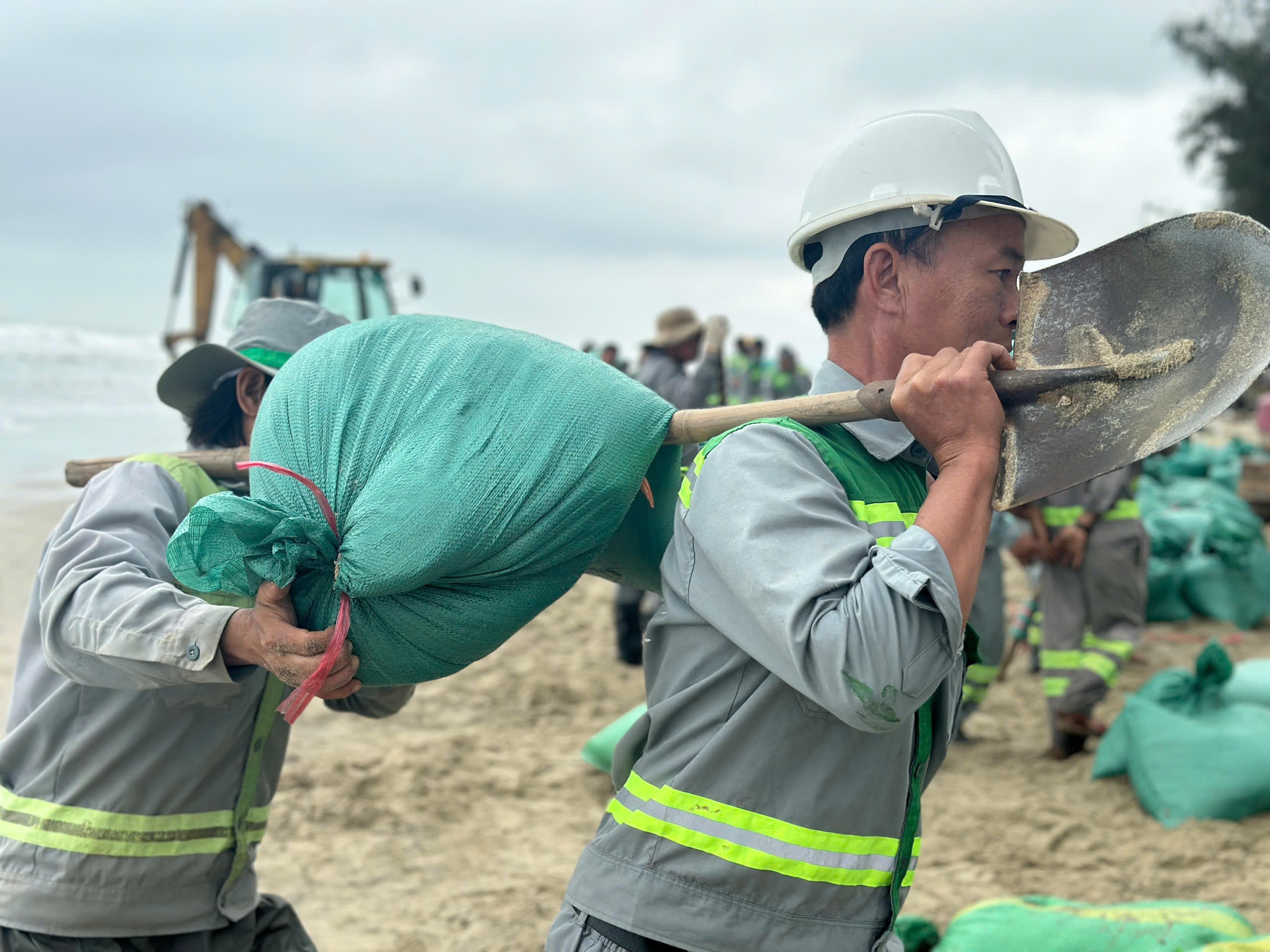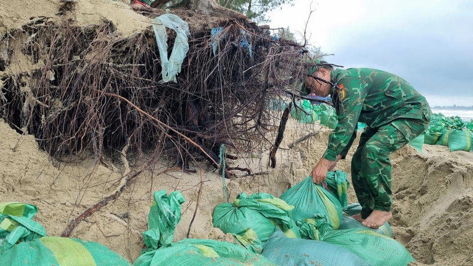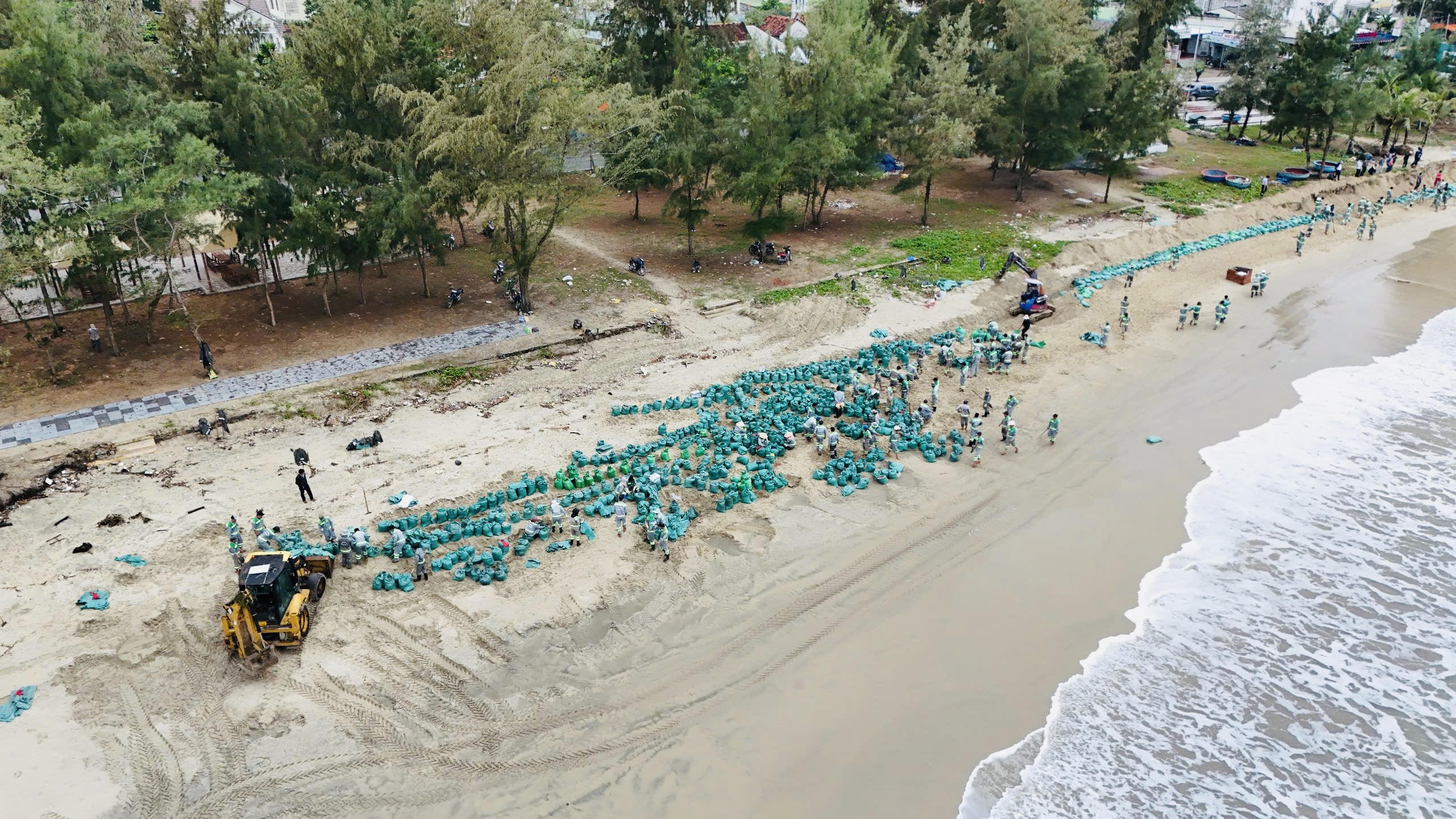 Các đơn vị phân chia khu vực, tổ chức đổ cát vào bao rồi xếp dọc theo bờ biển nhằm hạn chế tác động của sóng lớn vào bờ gây gia tăng sạt lở.