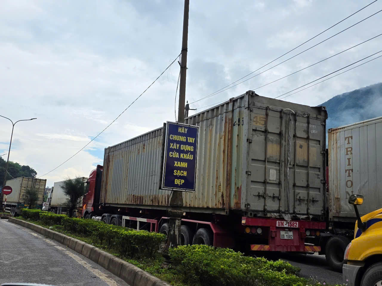 Tại khu vực trên, hàng trăm phương tiện như, container, xe tải, xe ô tô con… ùn ứ, nối đuôi nhau xếp hàng chờ làm thủ tục thông quan, kéo một hàng dài gần 2km.