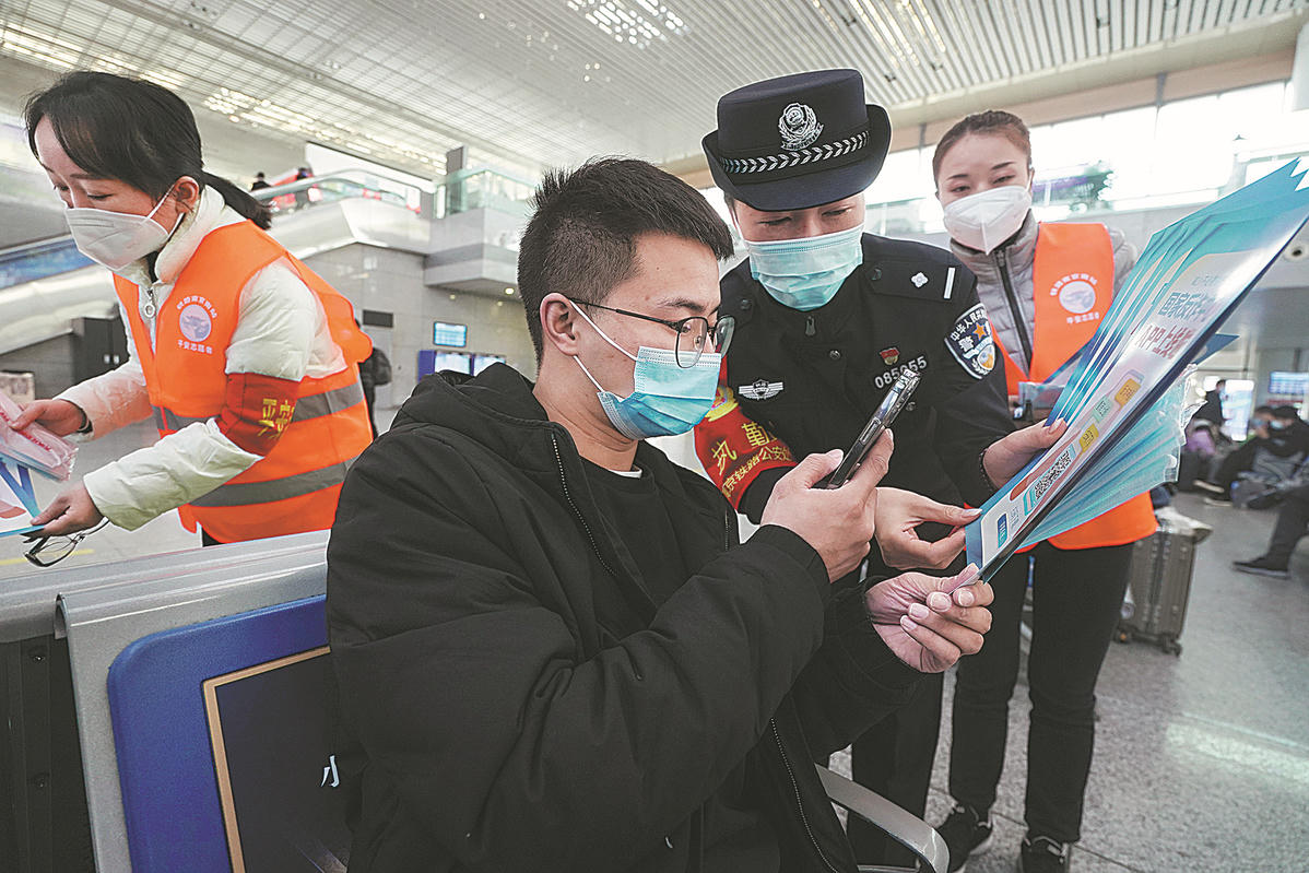 Sĩ quan cảnh sát và các tình nguyện viên phân phát tài liệu truyền thông chống gian lận trực tuyến tại Ga Nam Nam Kinh ở Nam Kinh, tỉnh Giang Tô, vào ngày 25/11/2021. Ảnh: Tân Hoa xã