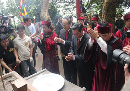 Đúng 7h34, tiếng chiêng, trống âm vang khắp núi Nghĩa Lĩnh linh thiêng cẩn cáo với ông cha tiên tổ. Chủ tịch Ủy ban Trung ương MTTQ Việt Nam Nguyễn Thiện Nhân cùng đại diện các vị đại biểu vào dâng hương hành lễ tại Thượng cung.