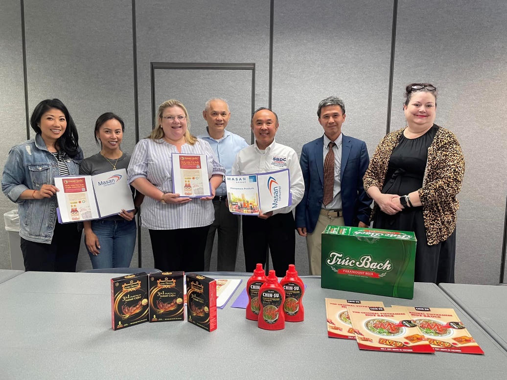 Ông Nguyễn Mạnh Quyền (thứ 2 từ phải sang) cùng với đội ngũ doanh nhân, doanh nghiệp có mong muốn đưa thương hiệu Việt vào Hoa Kỳ nhiều hơn. (Ảnh: ĐVCC). |